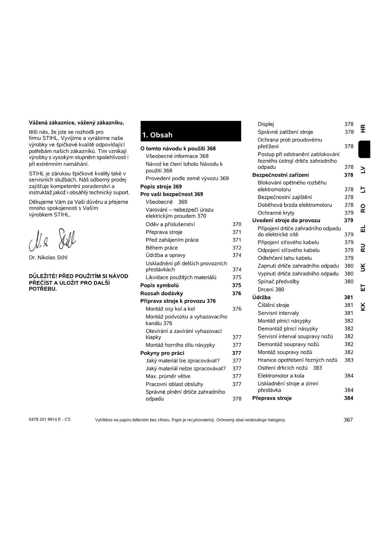 HRCS 0478 201 9914 E - CS LTROELRUUKETKK LV Vážená zákaznice, vážený zákazníku, těší nás, že jste se rozhodli pro firmu STIHL. Vyvíjíme a vyrábíme naše výrobky ve špičkové kvalitě odpovídající potřebám našich zákazníků. Tím vznikají výrobky s vysokým stupněm spolehlivosti i při extrémním namáhání. STIHL je zárukou špičkové kvality také v servisních službách. Náš odborný prodej zajišťuje kompetentní poradenství a instruktáž jakož i obsáhlý technický suport. Děkujeme Vám za Vaši důvěru a přejeme mnoho spokojenosti s Vaším výrobkem STIHL. Dr. Nikolas Stihl DŮLEŽITÉ! PŘED POUŽITÍM SI NÁVOD PŘEČÍST A ULOŽIT PRO DALŠÍ POTŘEBU. Vytištěno na papíru běleném bez chloru. Papír je recyklovatelný. Ochranný obal neobsahuje halogeny.