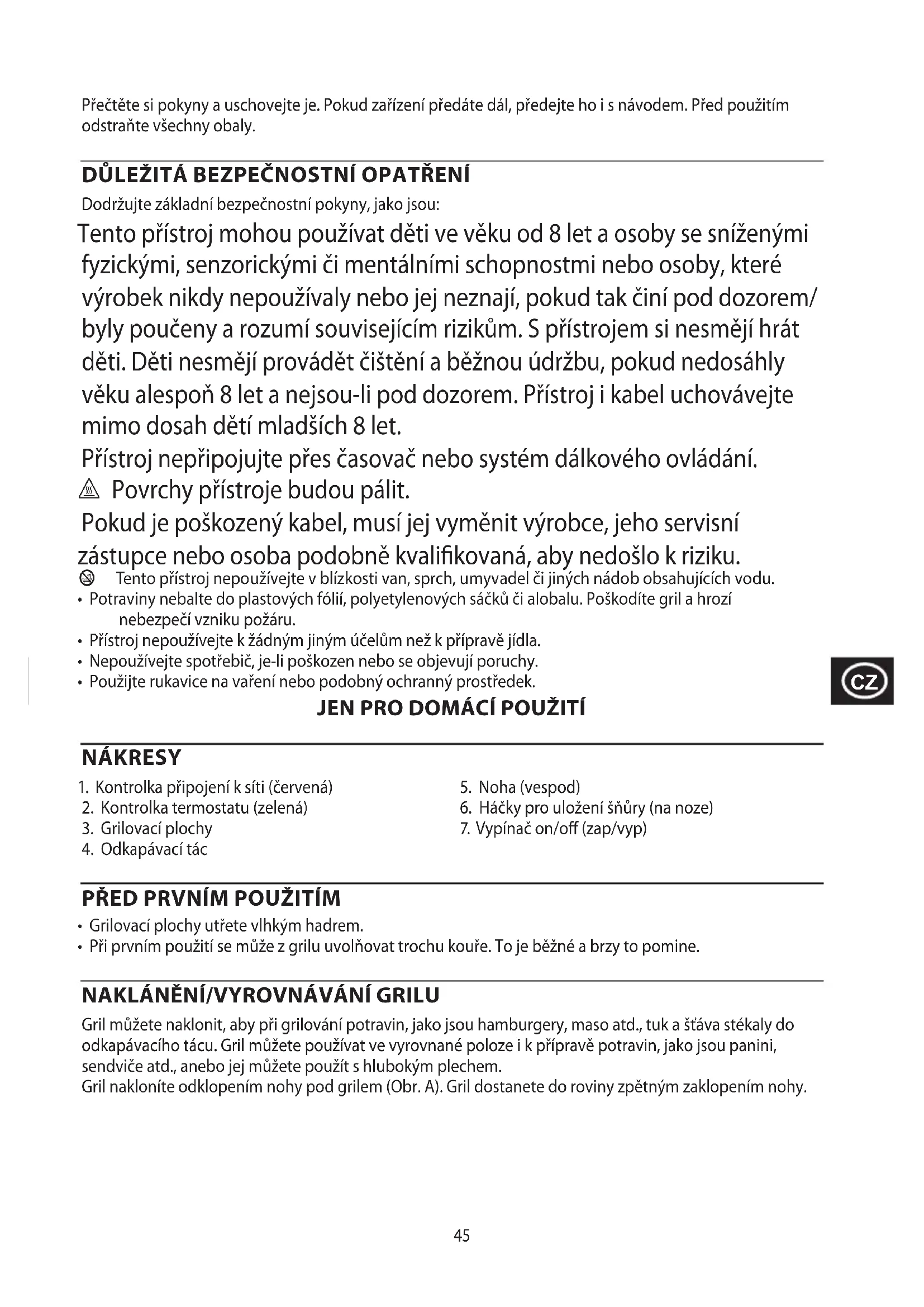 Во избежание воздействия вредных веществ на окружающую среду и здоровье приборы и батареи одноразового или многоразового использования, помеченные одним из этих символов, необходимо утилизировать отдельно от несортированных бытовых отходов. Обязательно утилизируйте электрические и электронные изделия, а также (если это применимо) батареи одноразового или многоразового использования в соответствующих официальных пунктах повторной переработки/сбора отходов.45 Přečtěte si pokyny a uschovejte je. Pokud zařízení předáte dál, předejte ho i s návodem. Před použitím odstraňte všechny obaly. DŮLEŽITÁ BEZPEČNOSTNÍ OPATŘENÍ Dodržujte základní bezpečnostní pokyny, jako jsou: Tento přístroj mohou používat děti ve věku od 8 let a osoby se sníženými fyzickými, senzorickými či mentálními schopnostmi nebo osoby, které výrobek nikdy nepoužívaly nebo jej neznají, pokud tak činí pod dozorem/ byly poučeny a rozumí souvisejícím rizikům. S přístrojem si nesmějí hrát děti. Děti nesmějí provádět čištění a běžnou údržbu, pokud nedosáhly věku alespoň 8 let a nejsou-li pod dozorem. Přístroj i kabel uchovávejte mimo dosah dětí mladších 8 let. Přístroj nepřipojujte přes časovač nebo systém dálkového ovládání. ¬ Povrchy přístroje budou pálit. Pokud je poškozený kabel, musí jej vyměnit výrobce, jeho servisní zástupce nebo osoba podobně kvalikovaná, aby nedošlo k riziku. b Tento přístroj nepoužívejte v blízkosti van, sprch, umyvadel či jiných nádob obsahujících vodu.