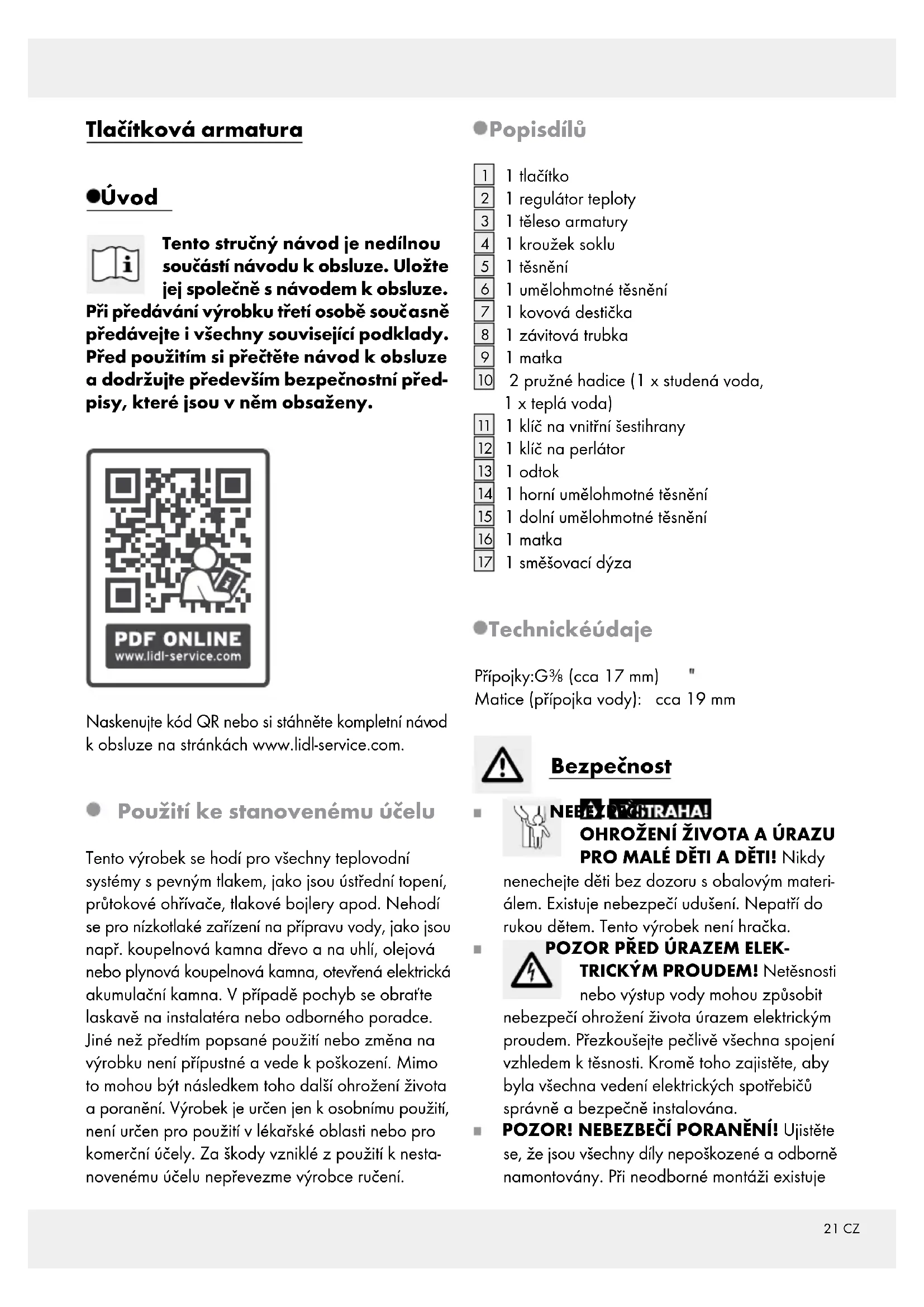 kobsluze na stránkách www.lidl-service.com. Použití ke stanovenému účelu Tento výrobek se hodí pro všechny teplovodní systémy spevným tlakem, jako jsou ústřední topení, průtokové ohřívače, tlakové bojlery apod. Nehodí se pro nízkotlaké zařízení na přípravu vody, jako jsou např. koupelnová kamna dřevo a na uhlí, olejová nebo plynová koupelnová kamna, otevřená elektrická akumulační kamna. Vpřípadě pochyb se obraťte laskavě na instalatéra nebo odborného poradce. Jiné než předtím popsané použití nebo změna na výrobku není přípustné a vede kpoškození. Mimo to mohou být následkem toho další ohrožení života a poranění. Výrobek je určen jen k osobnímu použití, není určen pro použití v lékařské oblasti nebo pro komerční účely. Za škody vzniklé z použití k nesta- novenému účelu nepřevezme výrobce ručení. Popis dílů