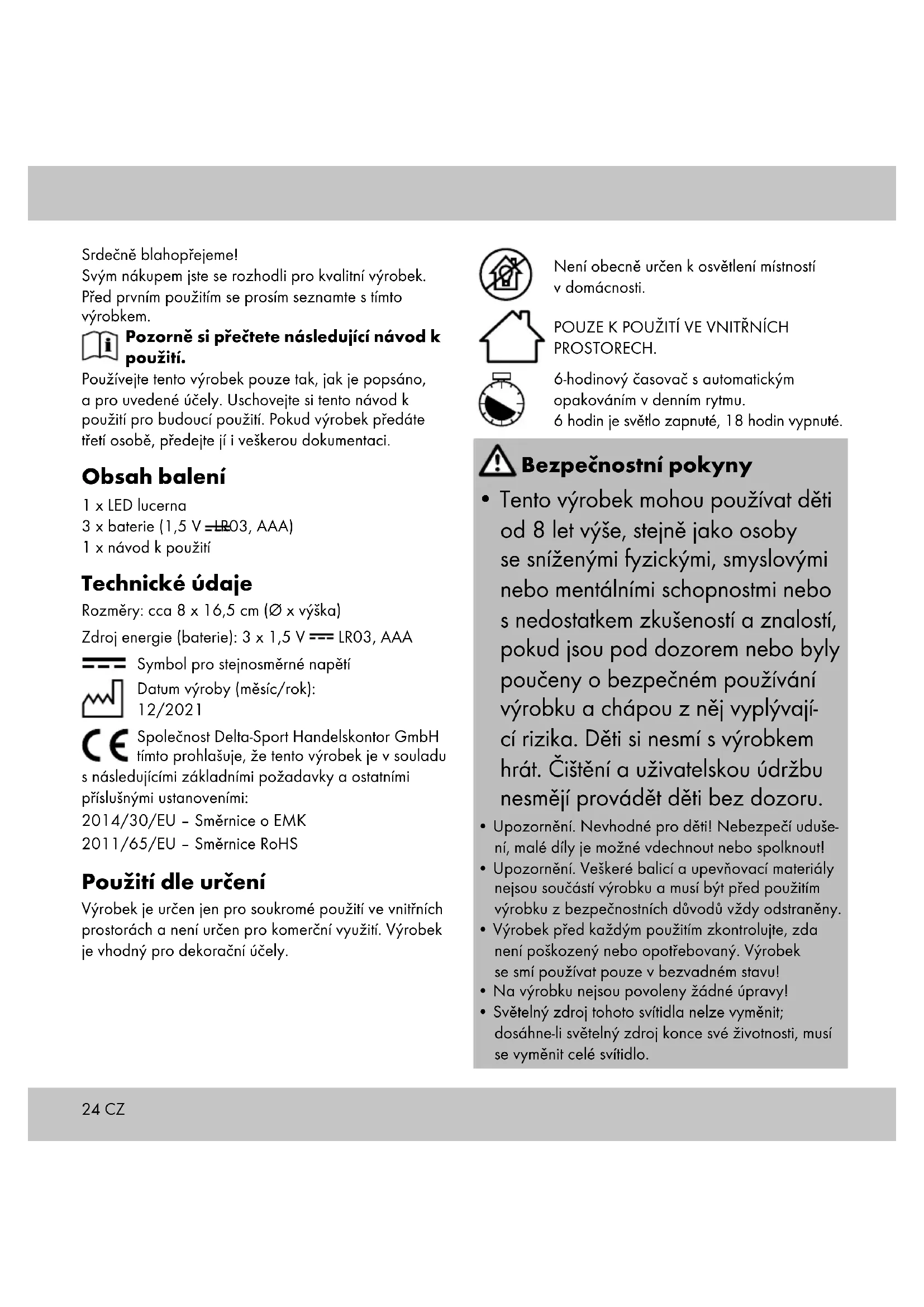 Výměna baterií Pokud tyto baterie nefungují, můžete je vyměnit. Při výměně baterií postupujte podle popisu v části „Vložení baterií“. Před vložením nových baterií vyjmě- te staré baterie z prostoru pro baterie. Zapnutí avypnutí světla (obr. A) Výrobek (1) zapnete přesunutím přepínače (1c) do polohy „ON“. Výrobek vypnete přesunutím přepínače (1c) do polohy „OFF“. Funkci časovače výrobku akti- vujete posunutím spínače (1c) do polohy „TIMER“. Upozornění: Při aktivované funkci časovače bude světlo 6 hodin zapnuté a 18 hodin vypnuté. Použití Výrobek lze postavit nebo pověsit v interiéru. Upozornění: Neumisťujte výrobek na citlivé povr- chy. Mohlo by dojít k jejich poškrábání. Při zavěšování výrobku dbejte na jeho vlastní hmotnost. CZ26 CZ Uskladnění, čištění Pokud výrobek nepoužíváte, skladujte jej vždy suchý, čistý, bez baterií a při pokojové teplotě. Čistěte pouze vlhkým hadříkem a následně otřete do sucha. DŮLEŽITÉ! K čištění nikdy nepoužívejte agresivní čisticí prostředky. Pokyny k likvidaci V zájmu ochrany životního prostředí nevyha- zujte svůj výrobek do odpadu v případě, že dosloužil, ale odneste jej na profesionální místo k likvidaci. O sběrných místech a jejich otevírací době se můžete informovat u příslušné místní správy. Vadné nebo použité baterie/akumulátory musejí být recyklovány v souladu se směrnicí 2006/66/ES a jejími změnami. Odevzdejte baterie/akumulátory a/ nebo výrobek prostřednictvím nabízených sběrných zařízení. Balicí materiály jako např. fóliové pytle ne- patří do rukou dětí. Uchovávejte balicí materiál mimo dosah dětí. Poškození životního prostředí v důsledku nesprávné likvidace baterií/akumulátorů! Baterie/akumulátory nesmějí být likvidovány spolu s komunálním odpadem. Mohou obsahovat toxické těžké kovy a podléhají zpracování nebezpeč- ného odpadu. Chemické symboly těžkých kovů jsou následující: Cd = kadmium, Hg = rtuť, Pb = olovo. Použité baterie/akumulátory proto likvidujte v místním sběrném místě. Výrobek a obal zlikvidujte ekologicky. Při třídění odpadu dodržujte označení balicích materiálů, které jsou označeny zkratkami (a) a čísly (b) s následujícím významem: 1–7: plasty/20–22: papír a karton/80–98: smíšený odpad. Výrobek a balicí materiály jsou recyklovatelné, likvi- dujte je odděleně pro lepší zpracování odpadu. Logo Triman platí pouze pro Francii. Možnosti likvidace výrobku, který dosloužil, jsou k dispozici u místní nebo městské správy. Pokyny k záruce a průběhu služby Výrobek byl vyroben s velkou péčí a za stálé kontroly. DELTA-SPORT HANDELSKONTOR GmbH poskytuje koncovým privátním zákazníkům na tento výrobek tři roky záruky od data nákupu (záruční lhůta) podle následující ustanovení. Záruka se týká pouze vad materiálu a závad ve zpracování. Záruka se nevztahuje na díly, které podléhají nor- málnímu opotřebení, a proto je nutné na ně pohlížet jako na rychle opotřebitelné díly (např. baterie), a na křehké díly, např. vypínače, akumulátory nebo díly vyrobené ze skla. Nároky z této záruky jsou vyloučeny, pokud výrobek byl používán neodborně nebo nedovoleným způso- bem nebo nikoli v rámci stanoveného účelu určení nebo předpokládaného rozsahu používání nebo nebyla dodržena zadání v návodu k obsluze, ledaže by koncový zákazník prokázal, že existuje vada materiálu nebo došlo k chybě ve zpracování, které nevyplývají z některé výše uvedených okolností. Nároky ze záruky lze uplatnit pouze v rámci záruční lhůty po předložení originálního pokladního dokladu. Proto si prosím uschovejte originál pokladního dokla- du. Doba záruky se neprodlužuje případnými oprava- mi na základě záruky, zákonné záruky nebo kulance. Totéž platí také pro vyměněné a opravené díly. Při reklamacích se prosím obracejte na níže uvedenou horkou linku servisu nebo se s námi spojte e-mailem. Pokud se vyskytne případ reklamace, výrobek Vám – dle naší volby – bezplatně opravíme, vyměníme nebo Vám vrátíme kupní cenu. Další práva ze záruky nevznikají.27 Vaše zákonná práva, zejména nároky na zajištění zá- ruky vůči konkrétnímu prodejci, nejsou touto zárukou omezena. IAN: 398633_2107 Servis Česko Tel.: 800143873 E-Mail: deltasport@lidl.cz CZ28 SK Blahoželáme! Svojím nákupom ste sa rozhodli pre kvalitný výro- bok. Pred prvým použitím sa s výrobkom dôkladne oboznámte. Pozorne si prečítajte tento návod na použivanie. Výrobok používajte len uvedeným spôsobom a na uvedený účel. Tento návod na použivanie si dobre uschovajte. Pri odovzdávaní výrobku tretej osobe odovzdajte s výrobkom aj všetky podklady. Rozsah dodávky 1 x LED lampáš 3 x batéria (1,5 V LR03, AAA) 1 x návod na používanie Technické údaje Rozmery: cca 8 x 16,5 cm (Ø x v) Napájanie batériou: 3 x 1,5 V LR03, AAA Symbol pre jednosmerné napätie Dátum výroby (mesiac/rok): 12/2021 Spoločnosť Delta-Sport Handelskontor GmbH týmto vyhlasuje, že tento výrobok je v súla- de s nasledujúcimi základnými požiadavkami a ostat- nými príslušnými ustanoveniami: 2014/30/EU – Smernica o elektromagnetickej kompatibilite 2011/65/EÚ – Smernica RoHS Určené použitie Výrobok je určený len na súkromné použitie v interiéri a nie je určený na komerčné použitie. Výrobok je vhodný na dekoratívne účely. Výrobok nie je vhodný na všeobecné osvetlenie priestorov v domácnosti. LEN NA POUŽITIE V INTERIÉROCH. 6-hodinový časovač s automatickým opakovaním v dennom rytme. 6 hodín zapnuté svetlo, 18 hodín vypnuté svetlo. Bezpečnostné pokyny