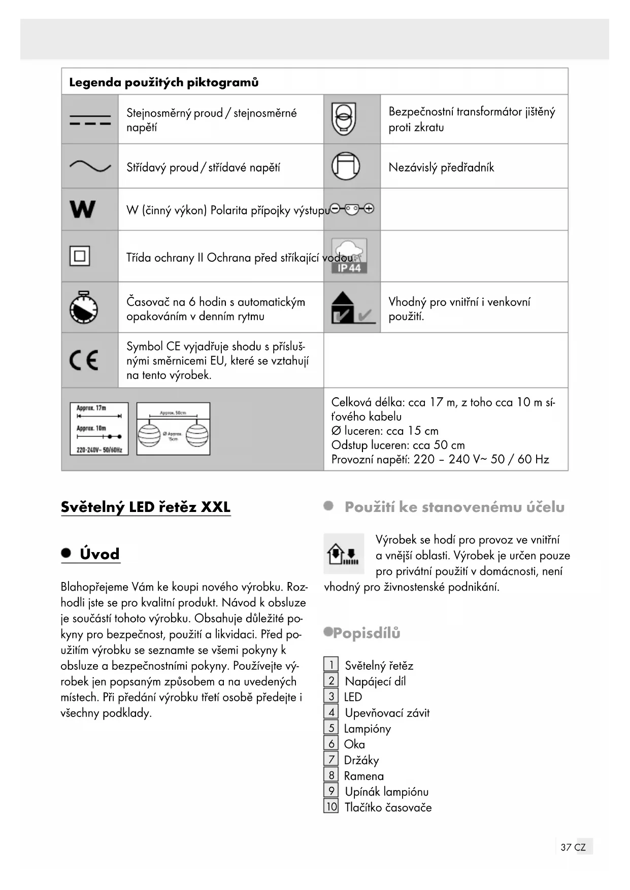 Při třídění odpadu se řiďte podle ozna- čení obalových materiálů zkratkami (a) a čísly (b), s následujícím významem: 1–7: umělé hmoty / 20–22: papír a lepenka / 80–98: složené látky. Výrobek a obalové materiály jsou recy- klovatelné, zlikvidujte je odděleně pro lepší odstranění odpadu. Logo Triman platí jen pro Francii. O možnostech likvidace vysloužilých zařízení se informujte u správy vaší obce nebo města. Vzájmu ochrany životního prostředí vysloužilý výrobek nevyhazujte do do- movního odpadu, ale předejte k od- borné likvidaci. O sběrnách a jejich otevíracích hodinách se můžete infor- movat u příslušné správy města nebo obce. Záruka Výrobek byl vyroben s nejvyšší pečlivostí podle přísných kvalitativních směrnic a před odesláním prošel výstupní kontrolou. V případě závad máte možnost uplatnění zákonných práv vůči prodejci. Vaše práva ze zákona nejsou omezena naší níže uvedenou zárukou. Na tento artikl platí 3 záruka od data zakoupení. Záruční lhůta začíná od data zakoupení. Uschovejte si dobře originál pokladní stvrzenky. Tuto stvrzenku budete potřebovat jako doklad o zakoupení. Pokud se do 3 let od data zakoupení tohoto vý- robku vyskytne vada materiálu nebo výrobní vada, výrobek Vám – dle našeho rozhodnutí – bezplatně opravíme nebo vyměníme. Tato záruka zaniká, jest- liže se výrobek poškodí, neodborně použil nebo neobdržel pravidelnou údržbu. Záruka platí na vady materiálu a výrobní vady. Tato záruka se nevztahuje na díly výrobku podléhající opotřebení (např. na baterie), dále na poškození křehkých, choulostivých dílů, např. vypínačů, aku- mulátorů nebo dílů zhotovených ze skla. Postup v případě uplatňování záruky Pro zajištění rychlého zpracování Vašeho případu se řiďte následujícími pokyny: Pro všechny požadavky si připravte pokladní stvr- zenku a číslo artiklu (IAN 386589_2107) jako doklad o zakoupení. Číslo artiklu najdete na typovém štítku, gravuře, titulní stránce návodu (vlevo dole) nebo na ná- lepce na zadní nebo spodní straně. V případě poruch funkce nebo jiných závad nejdříve kontaktujte, telefonicky nebo e-mailem, v následujícím textu uvedené servisní oddělení. Výrobek registrovaný jako vadný potom můžete s přiloženým dokladem o zakoupení (pokladní stvr- zenkou) a údaji k závadě a kdy k ní došlo, bez- platně zaslat na adresu servisu, která Vám byla sdělena. Servis Servis Česká republika Tel.: 800600632 E-Mail: owim@lidl.cz41 SK Legenda použitých piktogramov ........................................................................Strana 42 Úvod ............................................................................................................................................. Strana 42 Používanie v súlade s určeným účelom ......................................................................................Strana 42 Popis častí ..................................................................................................................................... Strana 42 Technické údaje ...........................................................................................................................Strana 43 Obsah dodávky ...........................................................................................................................Strana 43 Bezpečnostné upozornenia ...................................................................................... Strana 43 Montáž lampióna ..............................................................................................................Strana 44 Používanie ..............................................................................................................................Strana 44 Funkcia časovača ........................................................................................................................Strana 44 Čistenie a údržba ...............................................................................................................Strana 45 Likvidácia ................................................................................................................................. Strana 45 Záruka ........................................................................................................................................Strana 45 Postup v prípade poškodenia v záruke ......................................................................................Strana 45 Servis .............................................................................................................................................Strana 4642 SK Legenda použitých piktogramov Jednosmerný prúd/napätie Skratuvzdorný bezpečnostný transformátor Striedavý prúd/napätie Nezávislý prevádzkový prístroj Watt (efektívny výkon) Polarita výstupnej svorky Trieda ochrany II S ochranou proti striekajúcej vode 6-hodinový časovač s automatickým opakovaním v dennom rytme Vhodné do interiéru a exteriéru. Značka CE označuje zhodu s prísluš- nými smernicami EÚ platnými pre tento výrobok. Celková dĺžka: cca 17 m, z toho cca. 10 m sieťové vedenie Ø lampášov: cca 15 cm Odstup medzi lampášmi: cca 50 cm Prevádzkové napätie: 220 – 240 V∼ 50/60 Hz LED svetelná reťaz XXL Úvod Blahoželáme Vám ku kúpe Vášho nového výrobku. Rozhodli ste sa pre veľmi kvalitný výrobok. Návod na obsluhu je súčasťou tohto výrobku. Obsahuje dôležité upozornenia týkajúce sa bezpečnosti, používania a likvidácie. Skôr ako začnete výro- bok používať, oboznámte sa so všetkými pokynmi k obsluhe a bezpečnosti. Výrobok používajte iba v súlade s popisom a v uvedených oblastiach po- užívania. V prípade postúpenia výrobku ďalším osobám odovzdajte aj všetky 