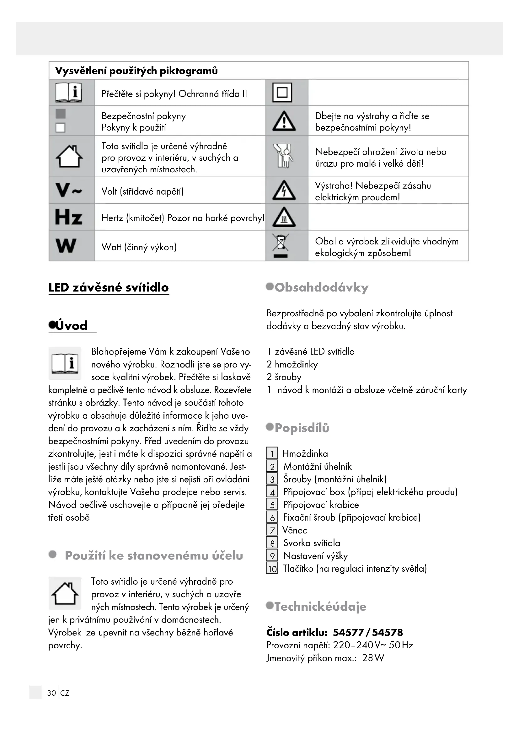Als er geen sprake is van een garantiegeval: Stuur het artikel alstublieft niet gerepareerd tegen de ontstane transportkosten terug. Deel mij de kosten mee. Repareer het artikel tegen betaling. Obsah29 CZ Garantie / Service Vysvětlení použitých piktogramů ...........................................................................Strana 30 Úvod .................................................................................................................................................Strana 30 Použití ke stanovenému účelu..........................................................................................................Strana 30 Obsah dodávky ............................................................................................................................... Strana 30 Popis dílů ..........................................................................................................................................Strana 30 Technické údaje ...............................................................................................................................Strana 30 Bezpečnost ..................................................................................................................................Strana 31 Bezpečnostní pokyny .......................................................................................................................Strana 31 Příprava ........................................................................................................................................Strana 32 Potřebné nářadí a materiál ..............................................................................................................Strana 32 Před instalací .............................................................................................................................Strana 32 Uvedení do provozu ...........................................................................................................Strana 32 Montáž svítidla .................................................................................................................................Strana 32 Tlumení světla ................................................................................................................................... Strana 32 Nasměrování svítidla ....................................................................................................................... Strana 32 Údržba a čištění ......................................................................................................................Strana 32 Odstranění do odpadu .....................................................................................................Strana 33 Prohlášení oshodě ..............................................................................................................Strana 33 Záruka / Servis ........................................................................................................................Strana 33 Záruka ..............................................................................................................................................Strana 33 Adresa servisu .................................................................................................................................. Strana 33 Záruční karta .................................................................................................................................... Strana 34 Obsah30 CZ Úvod / Bezpečnost Úvod Vysvětlení použitých piktogramů Přečtěte si pokyny! Ochranná třída II Bezpečnostní pokyny Pokyny k použití Dbejte na výstrahy a řiďte se bezpečnostními pokyny! Toto svítidlo je určené výhradně pro provoz vinteriéru, vsuchých a uzavřených místnostech. Nebezpečí ohrožení života nebo úrazu pro malé i velké děti! Volt (střídavé napětí) Výstraha! Nebezpečí zásahu elektrickým proudem! Hertz (kmitočet) Pozor na horké povrchy! Watt (činný výkon) Obal a výrobek zlikvidujte vhodným ekologickým způsobem! LED závěsné svítidlo Úvod Blahopřejeme Vám k zakoupení Vašeho nového výrobku. Rozhodli jste se pro vy- soce kvalitní výrobek. Přečtěte si laskavě kompletně a pečlivě tento návod k obsluze. Rozevřete stránku sobrázky. Tento návod je součástí tohoto výrobku a obsahuje důležité informace k jehouve- dení do provozu a kzacházení sním. Řiďte se vždy bezpečnostními pokyny. Před uvedením do provozu zkontrolujte, jestli máte kdispozici správné napětí a jestli jsou všechny díly správně namontované. Jest- liže máte ještě otázky nebo jste si nejistí při ovládání výrobku, kontaktujte Vašeho prodejce nebo servis. Návod pečlivě uschovejte a případně jej předejte třetí osobě. Použití ke stanovenému účelu Toto svítidlo je určené výhradně pro provoz vinteriéru, vsuchých a uzavře- ných místnostech. Tento výrobek je určený jen k privátnímu používání v domácnostech. Výrobek lze upevnit na všechny běžně hořlavé povrchy. Obsah dodávky Bezprostředně po vybalení zkontrolujte úplnost dodávky a bezvadný stav výrobku. 1 závěsné LED svítidlo 2 hmoždinky 2 šrouby 1 návod k montáži a obsluze včetně záruční karty Popis dílů