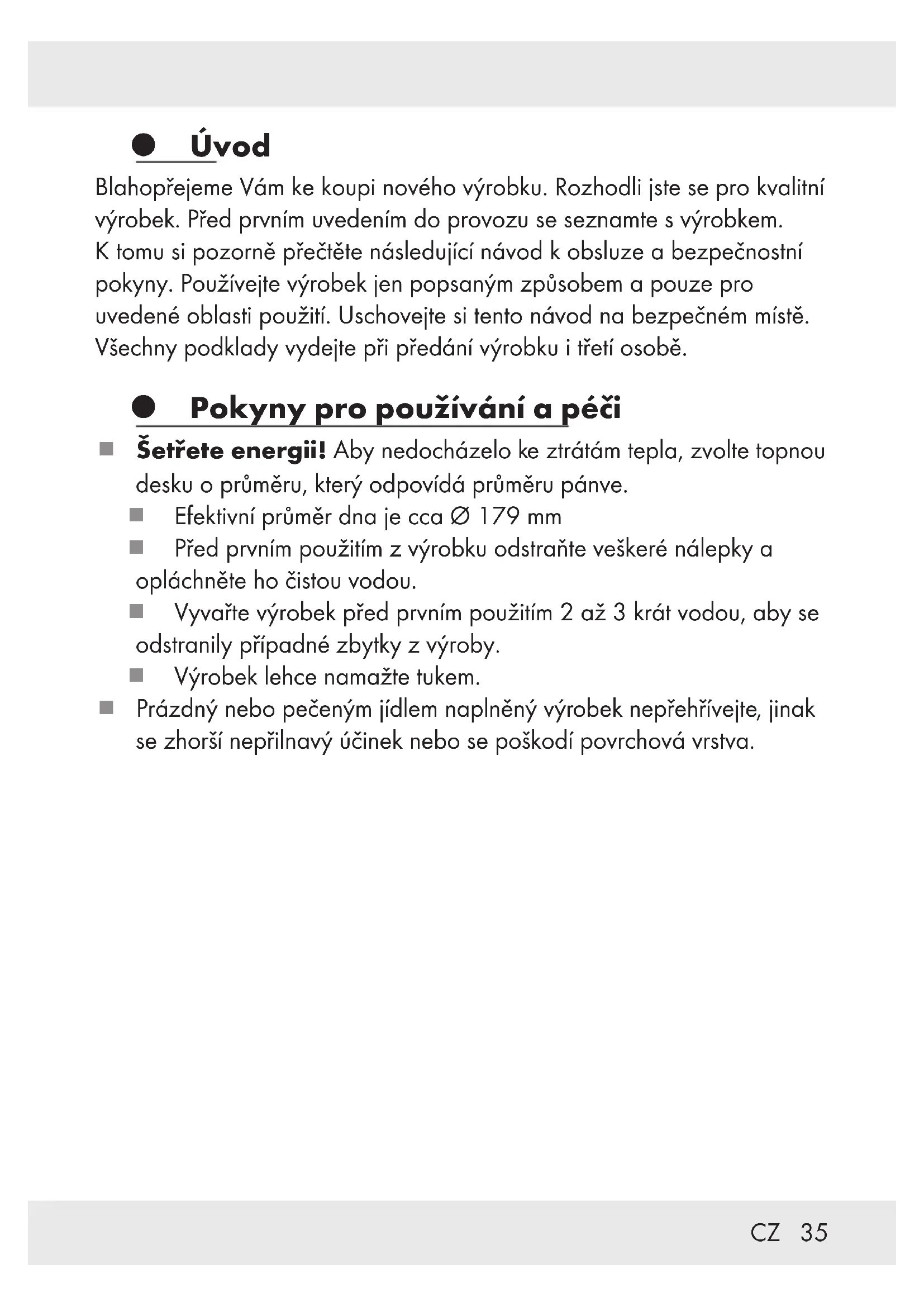 Úvod Blahopřejeme Vám ke koupi nového výrobku. Rozhodli jste se pro kvalitní výrobek. Před prvním uvedením do provozu se seznamte s výrobkem. K tomu si pozorně přečtěte následující návod k obsluze a bezpečnostní pokyny. Používejte výrobek jen popsaným způsobem a pouze pro uvedené oblasti použití. Uschovejte si tento návod na bezpečném místě. Všechny podklady vydejte při předání výrobku i třetí osobě. Pokyny pro používání a péči Šetřete energii! Aby nedocházelo ke ztrátám tepla, zvolte topnou desku o průměru, který odpovídá průměru pánve. Efektivní průměr dna je cca Ø179mm Před prvním použitím z výrobku odstraňte veškeré nálepky a opláchněte ho čistou vodou. Vyvařte výrobek před prvním použitím 2až3krát vodou, aby se odstranily případné zbytky z výroby. Výrobek lehce namažte tukem. Prázdný nebo pečeným jídlem naplněný výrobek nepřehřívejte, jinak se zhorší nepřilnavý účinek nebo se poškodí povrchová vrstva.36 CZ Nebezpečí přehřátí! U tukem nenamazaném přehřátém výrobku může dojít při kontaktu stuk neobsahující připravovanou potravinou ke zbarvení nepřilnavého povrchu v důsledku spalování proteinů. Tato zabarvení je třeba považovat za stopy používání, nepředstavují žádné narušení jakosti povlaku a jeho způsobilosti pro používání. Ohřívejte připravované potraviny při vyšším/středním ohřevu a nechte je pak na nízkém stupni dovařit. Nenechávejte výrobek bez dozoru, když se tuk zahřívá: Přehřátý tuk se může vznítit. Nikdy nehaste hořící tuk vodou! Zaduste plameny víkem hrnce nebo hustou vlněnou dekou. Používejte pouze plastové nebo dřevěné kuchyňské pomůcky abyste nepoškodili nepřilnavý povrch. Nekrájejte potraviny přímo ve výrobku. Do výrobku nevkládejte kapající maso. Prostřednictvím tuku stříkajícího na žhavou plotýnku sporáku může snadno vzniknout požár. Během vaření se může zahřát rukojeť. Pro svou ochranu používejte chňapky nebo grilovací rukavice. Výrobek je vhodná pro plynové, elektrické, sklokeramické, indukční a halogenové varné desky.37CZ Pokyn pro indukční varná pole: Za určitých okolností může nastat hluk, který je důsledkem elektromagnetických vlastností zdroje tepla a výrobku. To je normální a neznamená to závadu indukčního varného pole ani nádobí. Výrobek je třeba umístit do středu na indukční varné pole. VÝSTRAHA! Vysoká rychlost ohřevu! Kuchyňské nádobí při předehřevu nepřehřejte. V případě přehřátí musí být místnost důkladně vyvětrána. Tento výrobek kombinuje výhody hliníkového nádobí, jako jsou nízká hmotnost a vysoká tepelná vodivost, s výhodami vaření s indukcí. Aby to bylo možné, byly do hliníkového dna vloženy magnetické ocelové prvky. Dno tedy není průběžně magnetické, takže se na indukčních deskách, které jsou výrazně větší než průměr dna, může stát, že indukční cívky nereagují. To není nedostatek kvality a nepředstavuje narušení funkčnosti. Aby výrobek bezvadně fungoval, vždy jej prosím umístěte na varné pole, které odpovídá účinnému spodnímu průměru uvedenému v tomto návodu. Vysoké teploty mohou vést ke změně barvy vnější strany výrobku. Nejedná se o vadu materiálu a neovlivňuje to kvalitu nebo funkci výrobku. Nikdy nedávejte horký výrobek pod tekoucí studenou vodu. Spodní část výrobku by se tím mohla poškodit nebo z výrobku odpadnout.38 CZ Výrobek je vhodný pro uchovávání teplých potravin v troubě (max.160 °C po dobu 1hodiny). Tento výrobek je vhodný do myčky na nádobí. Pro ruční čištění použijte horkou vodu a obyčejný prostředek na mytí nádobí. Vyhněte se používání ostrých a špičatých předmětů nebo kartáčů, abyste nepoškodili materiál. K čištění nepoužívejte žádné ostré abrazivní prostředky. Časté čištění ostrými čisticími prostředky může vést k poškození a/ nebo změně barvy výrobku. Čištění v myčce může vést ke změně zbarvení hliníkových dílů. VÝSTRAHA! Skleněné víko je křehké/není odolné proti nárazům! VÝSTRAHA! ŠKRÁBANCE! Vyhněte se posouvání nádobí tam a zpět na sklokeramické varných polích! Než začnete s vařením, doporučujeme, abyste otřeli povrch varného pole a dno nádobí čistou, nežmolkující látkou (například z mikrovlákna). Tímto způsobem můžete předejít poškrábání. Bezpečné pro potraviny: Tento výrobek nemá vliv na chuť a vůni připravovaných jídel. Nikdy nepoužívejte výrobek, pokud jsou rukojeti nebo knoflík víka uvolněné. V případě potřeby utáhněte šroub rukojeti a knoflík víka. Zlikvidování Obal se skládá z ekologických materiálů, které můžete zlikvidovat prostřednictvím místních sběren recyklovatelných materiálů. O možnostech likvidace vysloužilých zařízení se informujte u správy vaší obce nebo města.39CZ Záruka Výrobek byl vyroben s nejvyšší pečlivostí podle přísných kvalitativních směrnic a před odesláním prošel výstupní kontrolou. V případě závad máte možnost uplatnění zákonných práv vůči prodejci. Vaše práva ze zákona nejsou omezena naší níže uvedenou zárukou. Na tento artikl platí 3 záruka od data zakoupení. Záruční lhůta začíná od data zakoupení. Uschovejte si dobře originál pokladní stvrzenky. Tuto stvrzenku budete potřebovat jako doklad o zakoupení. Pokud se do 3 let od data zakoupení tohoto výrobku vyskytne vada materiálu nebo výrobní vada, výrobek Vám – dle našeho rozhodnutí – bezplatně opravíme nebo vyměníme. Tato záruka zaniká, jestliže se výrobek poškodí, neodborně použil nebo neobdržel pravidelnou údržbu. Záruka platí na vady materiálu a výrobní vady. Tato záruka se nevztahuje na 