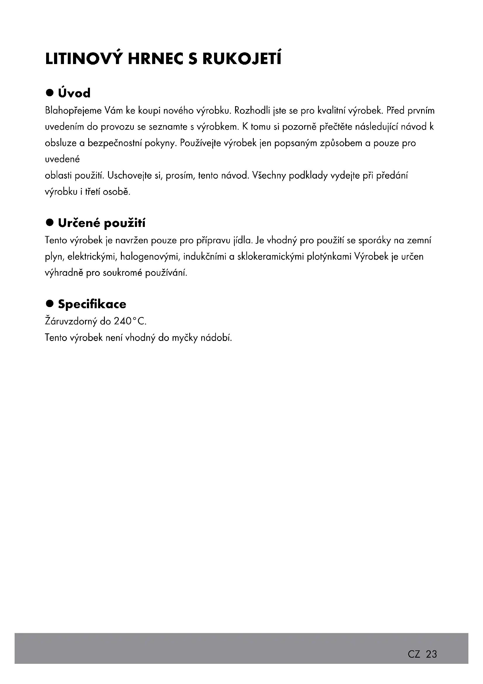 l Úvod Blahopřejeme Vám ke koupi nového výrobku. Rozhodli jste se pro kvalitní výrobek. Před prvním uvedením do provozu se seznamte s výrobkem. K tomu si pozorně přečtěte následující návod k obsluze a bezpečnostní pokyny. Používejte výrobek jen popsaným způsobem a pouze pro uvedené oblasti použití. Uschovejte si, prosím, tento návod. Všechny podklady vydejte při předání výrobku i třetí osobě. l Určené použití Tento výrobek je navržen pouze pro přípravu jídla. Je vhodný pro použití se sporáky na zemní plyn, elektrickými, halogenovými, indukčními a sklokeramickými plotýnkami Výrobek je určen výhradně pro soukromé používání. l Specifikace Žáruvzdorný do 240°C. Tento výrobek není vhodný do myčky nádobí.24 CZ Bezpečnostní pokyny ULOŽTE VŠECHNY BEZPEČNOSTNÍ POKYNY A POKYNY PRO POUŽITÍ PRO BUDOUCÍ NAHLÉDNUTÍ! n Uvědomte si, že se průběhu vaření mohou rukojeti velmi zahřát. Takže prosím použijte kuchyňské rukavice nebo grilovací rukavice na svou ochranu. n Dávejte výrobek, když je horký, na tepelně odolný podklad a ne na nechráněný povrch kuchyňské linky. n Během vaření je nesmírně důležité výrobek neztratit ze zřetele, když v něm zahříváte tuk. Tuk se může velmi rychle přehřát a vznítit se. V případě požáru tuku, se nikdy nepokoušejte požár uhasit vodou! Uduste plameny pokličkou nebo tlustou vlněnou dekou. n Ujistěte se, že nikdy nebudete zahřívat tento výrobek, kdy je prázdný. Když to nedodržíte, může to způsobit, že praskne emailový povrch. n Aby nedošlo k poškození smaltového povlaku, používejte pouze kuchyňské náčiní vyrobené z tepelně odolné umělé hmoty nebo ze dřeva. Nekrájejte žádné potraviny přímo ve výrobku. n Nikdy nevkládejte kapající mokré maso do horkého tuku. Výsledný stříkající tuk může přijít do styku se žhnoucí varnou deskou a dát vznik požáru. n Upozornění! Vždy výrobek při vaření v troubě nebo na sporáku se skleněnou plochu (např. sklokeramické, halogenové a indukční plotýnky) zvedejte. Nikdy ho neposouvejte površích jako jsou tyto, protože to může způsobit poškození spodní části výrobku, varné desky nebo trouby. n Vždy nastavte velikost plamenů plynu na spodní straně výrobku - plameny plynu by NIKDY neměly hořet po stranách výrobku. n Výrobek není v odolný pro použití v mikrovlnné troubě. n Výrobek je žáruvzdorný! Žáruvzdorný do 240°C. Umístěte přípravek na rošt v troubě, ne přímo na dno trouby. n Tento výrobek není vhodný do myčky nádobí. n Nepoužívejte pokličku, pokud se její rukojeť uvolní. V případě potřeby ji utáhněte. n BEZPEČNÉ PRO POTRAVINY! Chuť a aroma vašich potravin nejsou tímto výrobkem ovlivněny. n VÝSTRAHA! NEBEZPEČÍ OHROŽENÍ ŽIVOTA A NEHODY PRO MALÉ A VELKÉ DĚTI! Nenechávejte děti nikdy bez dohledu s obalovým materiálem. Hrozí nebezpečí udušení. Uchovávejte výrobek mimo dosah dětí. VÝSTRAHA! Nikdy nenechávejte malé děti bez dohledu v blízkosti horkého nádobí.CZ 25 l Používání n Před prvním použitím vyvařte výrobek 2 - 3 krát s vodou a odstraňte všechny zbytky vzniklé při výrobě. Pak výrobek vyčistěte teplou mýdlovou vodou, opláchněte čistou vodou a důkladně osušte. n Vetřete trochu oleje nebo másla do vnitřní strany výrobku. Pomalu výrobek zahřejte při nízké teplotě. Snižte teplotu, jakmile se tuk vsákne. Počkejte přibližně 2 - 3 minuty, až se výrobek se ochladí a odstraňte přebytečný tuk. n Nevařte nebo nepečte při vysoké teplotě. Litina je vynikající držák tepla, takže je střední teplota plně dostačující. Příliš vysoké teploty mohou vést k neuspokojivé výsledkům vaření nebo mohou způsobit, že se potraviny připečou, např. omeleta. n Spotřebič neohřívejte příliš rychle. V opačném případě může dojít k prasknutí smaltového povrchu, pokud se litina roztahuje rychleji než smalt. Povšimnete si, prosím: n Světlý smalt na vnitřní části výrobku je speciálně navržen pro pomalou přípravu pokrmů při nízké teplotě nebo na střední teplotu v troubě. n Výstupky na spodní straně pokličky způsobují cirkulaci uvnitř nádoby během vaření. Stoupající pára se sráží na víku a je rovnoměrně rozdělována do jídla, které připravujete prostřednictvím výstupků. To znamená, že vaše jídlo zůstane během vaření šťavnaté a tím si zachovává své přirozené chuti. n Smaltový povrch není vhodný pro suché vaření. Vždy použijte trochu másla nebo oleje na vaření a ujistěte se, že je spodní část výrobku před ohřevem plně zakryta.26 CZ l Informace pro použití s indukčními plotýnkami Vyberte velikost plotýnky, která odpovídá velikosti spodní strany výrobku, aby se zabránilo ztrátám tepla. n Efektivní velikost dna je přibližně 11,5 cm Povšimnete si, prosím: Za určitých okolností mohou elektromagnetické vlastnosti plotýnky a výrobku způsobit vznik zápachu. To je normální a neznamená to poškození vašeho indukční plotýnky nebo varné nádoby. n Dejte výrobek na střed indukční varné plotýnky. n UPOZORNĚNÍ! Vysoká rychlost ohřevu! Když předehříváte varnou nádobu, dejte pozor, aby nedošlo k přehřátí. n V případě přehřátí, důkladně místnost vyvětrejte. l Čištění a péče n Před čištěním nechte spotřebič trochu vychladnout. Nikdy neponořujte výrobek do studené vody, dokud je horký. Teplotní šok může poškodit smalt. Rovněž nikdy neplňte produkt studenou vodou. n Oplachujte výrobek horkou vodou a běžným čisticím prostředkem. n Nejdříve odmočte zbytky potravin a odstraňte je pomocí houby nebo kartáče. n Nikdy nepoužívejte žádné tvrdé předměty, ocelovou vlnu a/nebo abrazivní nebo agresivní čisticí pro