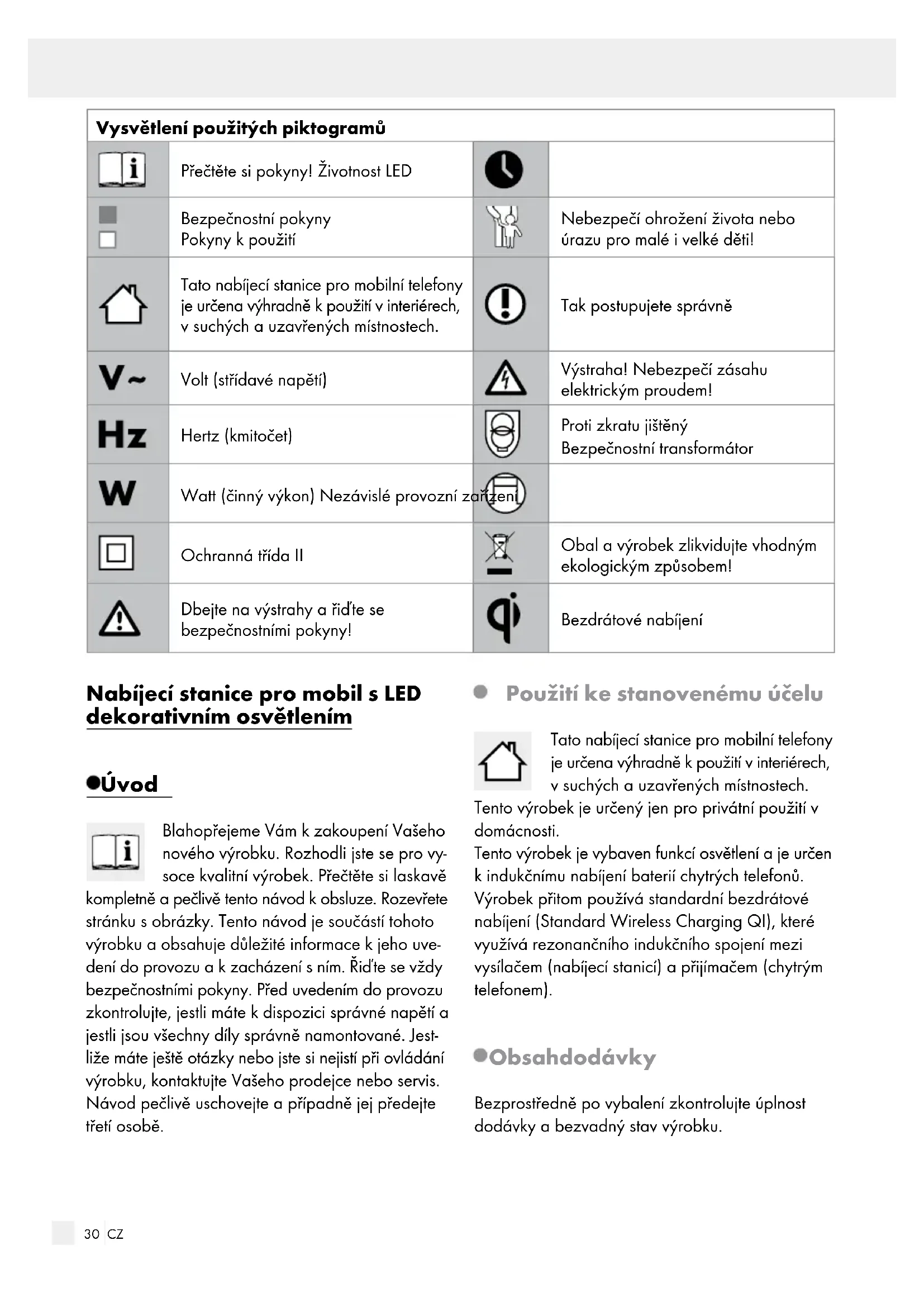 Als er geen sprake is van een garantiegeval: Stuur het artikel alstublieft niet gerepareerd tegen de ontstane transportkosten terug. Deel mij de kosten mee. Repareer het artikel tegen betaling. Obsah29 CZ Garantie / Service Vysvětlení použitých piktogramů ...........................................................................Strana 30 Úvod .................................................................................................................................................Strana 30 Použití ke stanovenému účelu..........................................................................................................Strana 30 Obsah dodávky ............................................................................................................................... Strana 30 Popis dílů ..........................................................................................................................................Strana 31 Technické údaje ...............................................................................................................................Strana 31 Bezpečnost ..................................................................................................................................Strana 31 Bezpečnostní pokyny .......................................................................................................................Strana 31 Uvedení do provozu ...........................................................................................................Strana 32 Tlumení světla ................................................................................................................................... Strana 32 Nastavení barev RGB ......................................................................................................................Strana 32 Nabíjení baterie chytrého telefonu ................................................................................................. Strana 32 Použití obalů na mobilní telefon ......................................................................................................Strana 32 Údržba a čištění ......................................................................................................................Strana 33 Zlikvidování ...............................................................................................................................Strana 33 Prohlášení oshodě ..............................................................................................................Strana 33 Záruka / Servis ........................................................................................................................Strana 33 Záruka ..............................................................................................................................................Strana 33 Adresa servisu .................................................................................................................................. Strana 34 Záruční karta .................................................................................................................................... Strana 34 Obsah30 CZ Úvod / Bezpečnost Úvod Vysvětlení použitých piktogramů Přečtěte si pokyny! Životnost LED Bezpečnostní pokyny Pokyny k použití Nebezpečí ohrožení života nebo úrazu pro malé i velké děti! Tato nabíjecí stanice pro mobilní telefony je určena výhradně kpoužití vinteriérech, vsuchých a uzavřených místnostech. Tak postupujete správně Volt (střídavé napětí) Výstraha! Nebezpečí zásahu elektrickým proudem! Hertz (kmitočet) Proti zkratu jištěný Bezpečnostní transformátor Watt (činný výkon) Nezávislé provozní zařízení Ochranná třída II Obal a výrobek zlikvidujte vhodným ekologickým způsobem! Dbejte na výstrahy a řiďte se bezpečnostními pokyny! Bezdrátové nabíjení Nabíjecí stanice pro mobil s LED dekorativním osvětlením Úvod Blahopřejeme Vám k zakoupení Vašeho nového výrobku. Rozhodli jste se pro vy- soce kvalitní výrobek. Přečtěte si laskavě kompletně a pečlivě tento návod k obsluze. Rozevřete stránku sobrázky. Tento návod je součástí tohoto výrobku a obsahuje důležité informace k jehouve- dení do provozu a kzacházení sním. Řiďte se vždy bezpečnostními pokyny. Před uvedením do provozu zkontrolujte, jestli máte kdispozici správné napětí a jestli jsou všechny díly správně namontované. Jest- liže máte ještě otázky nebo jste si nejistí při ovládání výrobku, kontaktujte Vašeho prodejce nebo servis. Návod pečlivě uschovejte a případně jej předejte třetí osobě. Použití ke stanovenému účelu Tato nabíjecí stanice pro mobilní telefony je určena výhradně kpoužití vinteriérech, vsuchých a uzavřených místnostech. Tento výrobek je určený jen pro privátní použití v domácnosti. Tento výrobek je vybaven funkcí osvětlení a je určen kindukčnímu nabíjení baterií chytrých telefonů. Výrobek přitom používá standardní bezdrátové nabíjení (Standard Wireless Charging QI), které využívá rezonančního indukčního spojení mezi vysílačem (nabíjecí stanicí) a přijímačem (chytrým telefonem). Obsah dodávky Bezprostředně po vybalení zkontrolujte úplnost dodávky a bezvadný stav výrobku.31 CZ Úvod / Bezpečnost Úvod 1 nabíjecí stanice pro mobil s LED dekorativním osvětlením 1 síťový zdroj (model TY1200100E1mn) 2 nabíjecí přijímače QI 1 návod k obsluze včetně záruční karty Popis dílů