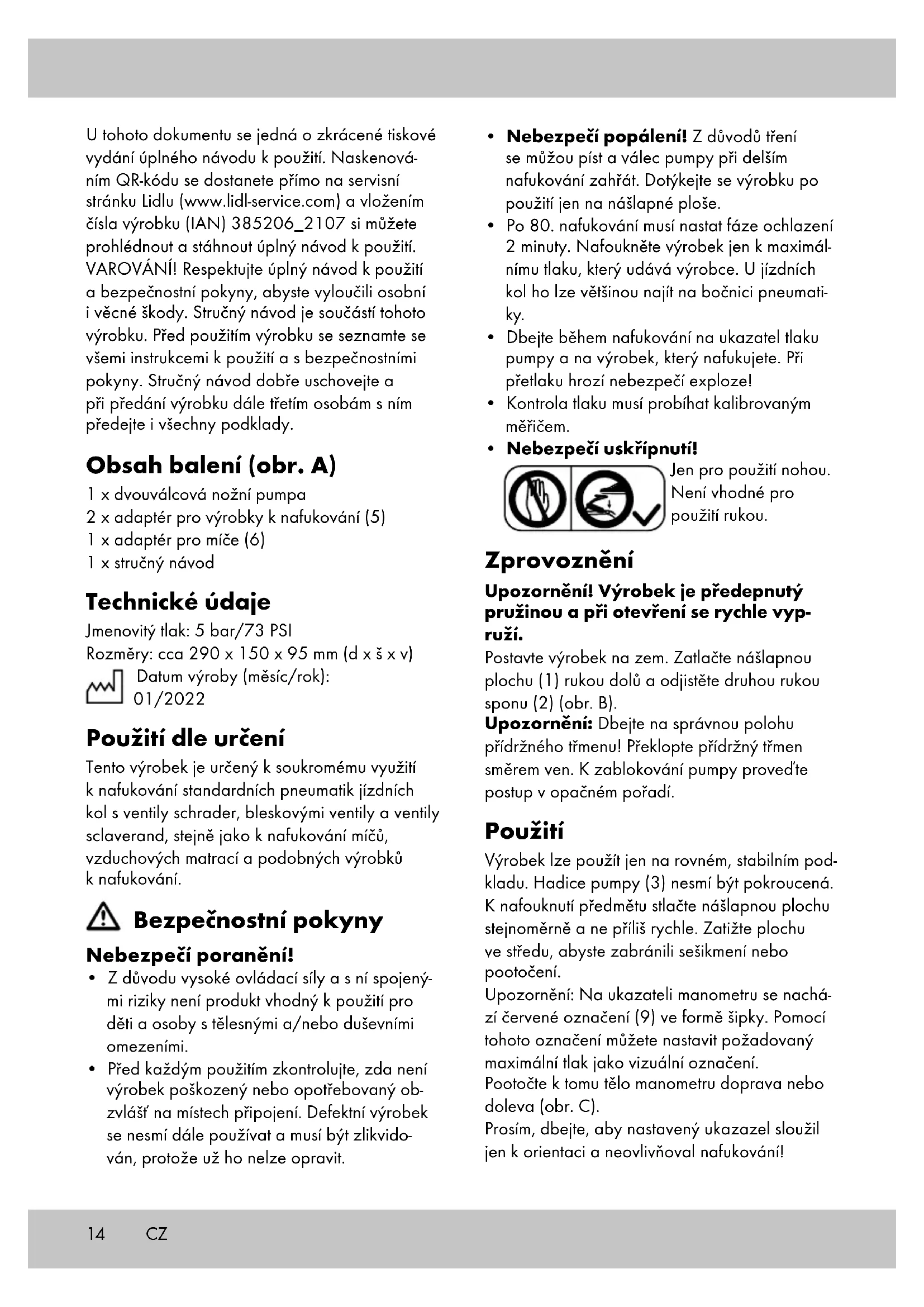 - Nebezpečí uskřípnutí! Jen pro použití nohou. Není vhodné pro použití rukou. Zprovoznění Upozornění! Výrobek je předepnutý pružinou a při otevření se rychle vyp- ruží. Postavte výrobek na zem. Zatlačte nášlapnou plochu (1) rukou dolů a odjistěte druhou rukou sponu (2) (obr. B). Upozornění: Dbejte na správnou polohu přídržného třmenu! Překlopte přídržný třmen směrem ven. K zablokování pumpy proveďte postup v opačném pořadí. Použití Výrobek lze použít jen na rovném, stabilním pod- kladu. Hadice pumpy (3) nesmí být pokroucená. K nafouknutí předmětu stlačte nášlapnou plochu stejnoměrně a ne příliš rychle. Zatižte plochu ve středu, abyste zabránili sešikmení nebo pootočení. Upozornění: Na ukazateli manometru se nachá- zí červené označení (9) ve formě šipky. Pomocí tohoto označení můžete nastavit požadovaný maximální tlak jako vizuální označení. Pootočte k tomu tělo manometru doprava nebo doleva (obr. C). Prosím, dbejte, aby nastavený ukazazel sloužil jen k orientaci a neovlivňoval nafukování! CZ15CZ Výběr otvoru (obr. D) Dvojitá hlava pumpičky má dva otvory. Malý otvor s popisem Presta, resp. s obrázkem úzkého ventilku se hodí pro ventilky Sclaverand a Blitz. Velký otvor s popisem Schrader, resp. s obrázkem širokého ventilku se hodí pro ventilky Schrader. Před tím, než začnete s pumpováním, vyberte vhodný otvor. Nafouknutí míčů (obr. E) Zasuňte adaptér pro míče (6) do velkého otvoru (8) dvojité hlavy čerpadla. Dejte upínací páku (4) nahoru k aretaci adapté- ru. Zasuňte poté adaptér do míče. Nafouknutí výrobků k nafouknutí (obr. F) Otevřete ventil výrobku k nafukování. Zasuň- te adaptér pro výrobky k nafukování (5) do velkého otvoru (8) dvojité hlavy čerpadla. Dejte upínací páku (4) nahoru k aretaci adaptéru. Zasuňte adaptér poté do ventilu výrobku k na- fukování. Nafouknutí pneumatik bleskovým ventilem (obr. G) Otevřete uzávěr ventilu pneumatiky. Strčte malý otvor (7) dvojité hlavy čerpadla na ventil. Dejte upínací páku (4) nahoru k aretaci adaptéru. Nafouknutí pneumatik ventilem schrader (obr. H) Otevřete uzávěr ventilu pneumatiky. Strčte velký otvor (8) dvojité hlavy čerpadla na ventil. Dejte upínací páku (4) nahoru k aretaci adaptéru. Nafouknutí pneumatik ventilem sclaverand (obr. I) Otevřete uzávěr ventilu pneumatiky. Uvolněte matku ventilu. Strčte malý otvor (7) dvojité hlavy čerpadla na ventil. Dejte upínací páku (4) naho- ru k aretaci adaptéru. Uskladnění, čištění Výrobek vždy uchovávejte na suchém a čistém místě s konstantní teplotou. Výrobek nikdy neponořujte do vody, jinak se poškodí! Důležité! Čistěte pouze vlhkým hadříkem a následně otřete do sucha. Namažte pohyblivé části občas trochou oleje.16 Pri tomto dokumente sa jedná o skrátený výtla- čok úplného návodu na používanie. Naskeno- vaním QR kódu sa dostanete priamo na stránku servisu Lidlu (www.lidl-service.com) a zadaním čísla výrobku (IAN) 385206_2107 si môžete pozrieť a stiahnuť úplný návod na používanie. VÝSTRAHA! Aby ste zabránili zraneniam osôb a vecným škodám, dbajte na úplný návod na používanie a pokyny pre bezpečnosť. Krátky ná- vod tvorí súčasť tohto výrobku. Pred používaním výrobku sa oboznámte so všetkými pokynmi pre používanie a bezpečnosť. Krátky návod dobre uschovajte a ak odovzdávate výrobok tretím osobám, odovzdajte im aj všetky podklady. Rozsah dodávky (obr. A) 1 x pumpa 2 x adaptér na nafukovacie výrobky (5) 1 x adaptér pre lopty (6) 1 x krátky návod Technické údaje Menovitý tlak: 5 bar/73 PSI Rozmery: cca 290 x 150 x 95 mm (d x š x v) Dátum výroby (mesiac/rok): 01/2022 Určené použitie Tento výrobok je určený na súkromné použitie na napumpovanie všetkých bežných pneumatík bicykla s autoventilom, cykloventilom a ga- luskovým ventilom, ako aj na napumpovanie lôpt, nafukovačiek a podobných nafukovacích výrobkov. Bezpečnostné pokyny Nebezpečenstvo poranenia!