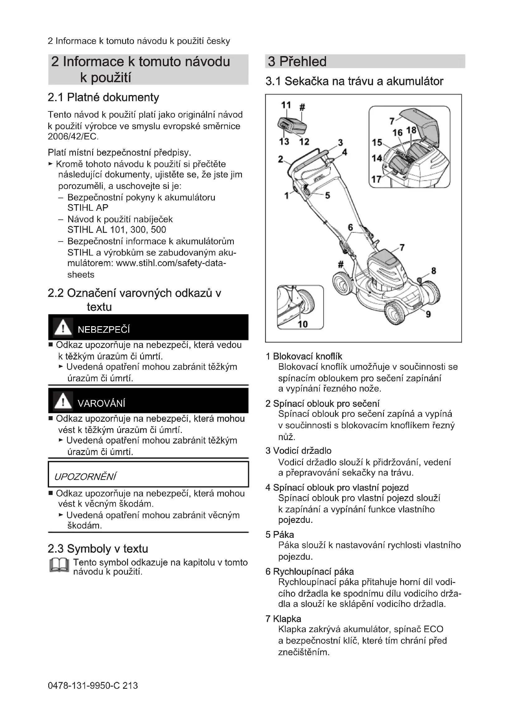 - 25 Bezpečnostně technické pokyny platné pro sekačku na trávu 1 Úvod Vážená zákaznice, vážený zákazníku, těší nás, že jste se rozhodli pro firmu STIHL. Vyvíjíme a vyrábíme naše výrobky ve špičkové kvalitě podle potřeb našich zákazníků. Tím vzni‐ kají výrobky s vysokým stupněm spolehlivosti i při extrémním namáhání. STIHL je zárukou špičkové kvality také v servis‐ ních službách. Náš odborný prodej zajišťuje kompetentní poradenství a instruktáž, jakož i obsáhlou technickou podporu. STIHL se výslovně zasazuje za trvale udržitelné a zodpovědné zacházení s přírodou. Tento návod k použití Vám má být oporou při bezpeč‐ ném a ekologickém používání Vašeho výrobku STIHL po dlouhý čas. Děkujeme Vám za Vaši důvěru a přejeme mnoho spokojenosti s Vaším výrobkem STIHL. Dr. Nikolas Stihl DŮLEŽITÉ! PŘED POUŽITÍM SI NÁVOD PŘE‐ ČTĚTE A ULOŽTE JEJ PRO DALŠÍ POTŘEBU. česky 212 0478-131-9950-C © ANDREAS STIHL AG & Co. KG 2021 0478-131-9950-C. VA1.L21. Vytištěno na bezchlórově běleném papíru. Tiskové barvy obsahují rostlinné oleje, papír je recyklovatelný. Překlad originálního návodu k použití 0000009417_004_CZ2 Informace k tomuto návodu k použití p. 233