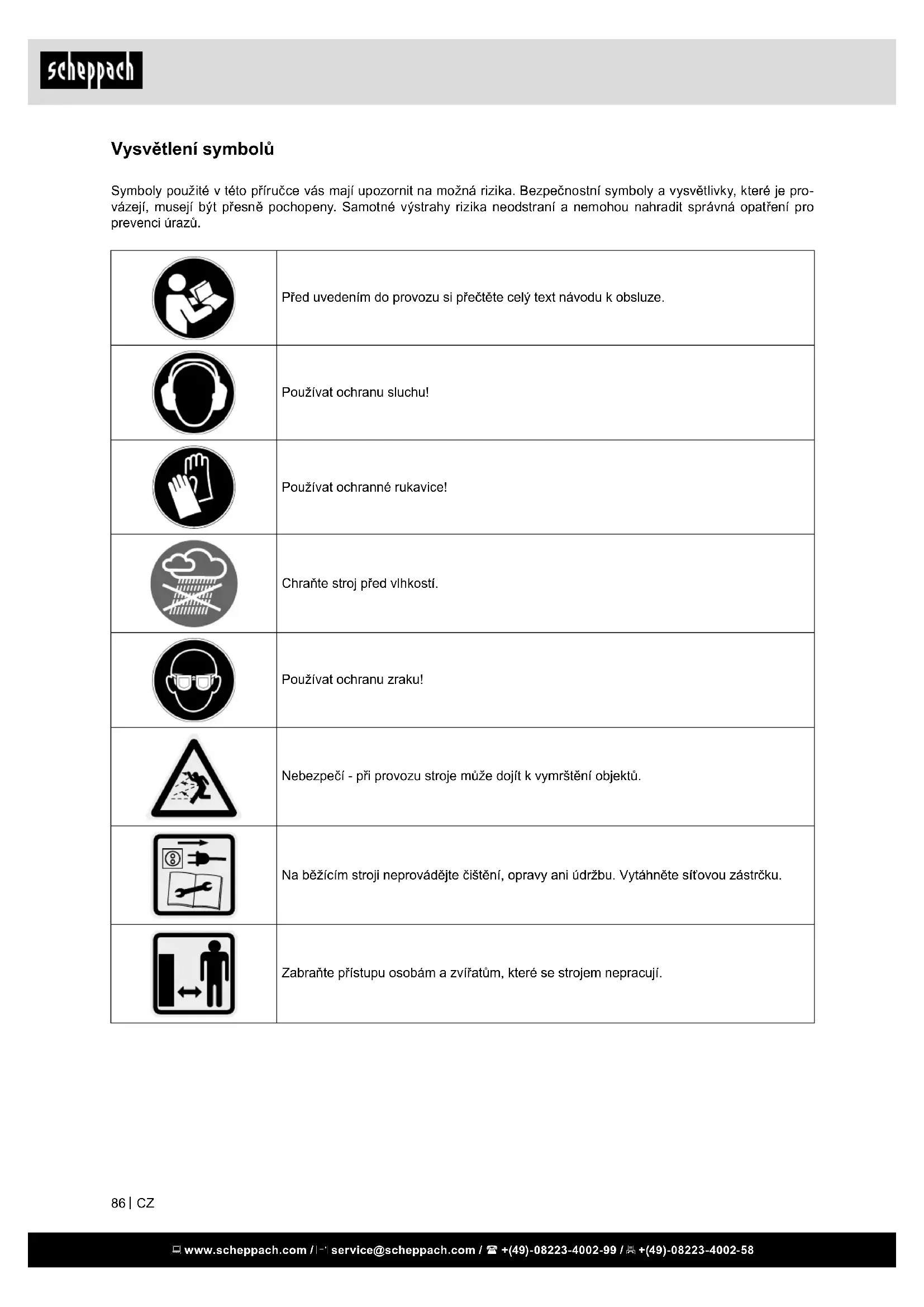 CZPozor! Nebezpečí zranění otáčejícím se nožovým kotoučem! Když stroj běží, mějte ruce a nohy vně otvorů. Nepoužívejte jako schod. m Upozornění! V následujícím textu jsou pokyny vztahující se bezpečnosti označeny symbolem vykřič- níku: www.scheppach.com / service@scheppach.com / +(49)-08223-4002-99 / +(49)-08223-4002-58