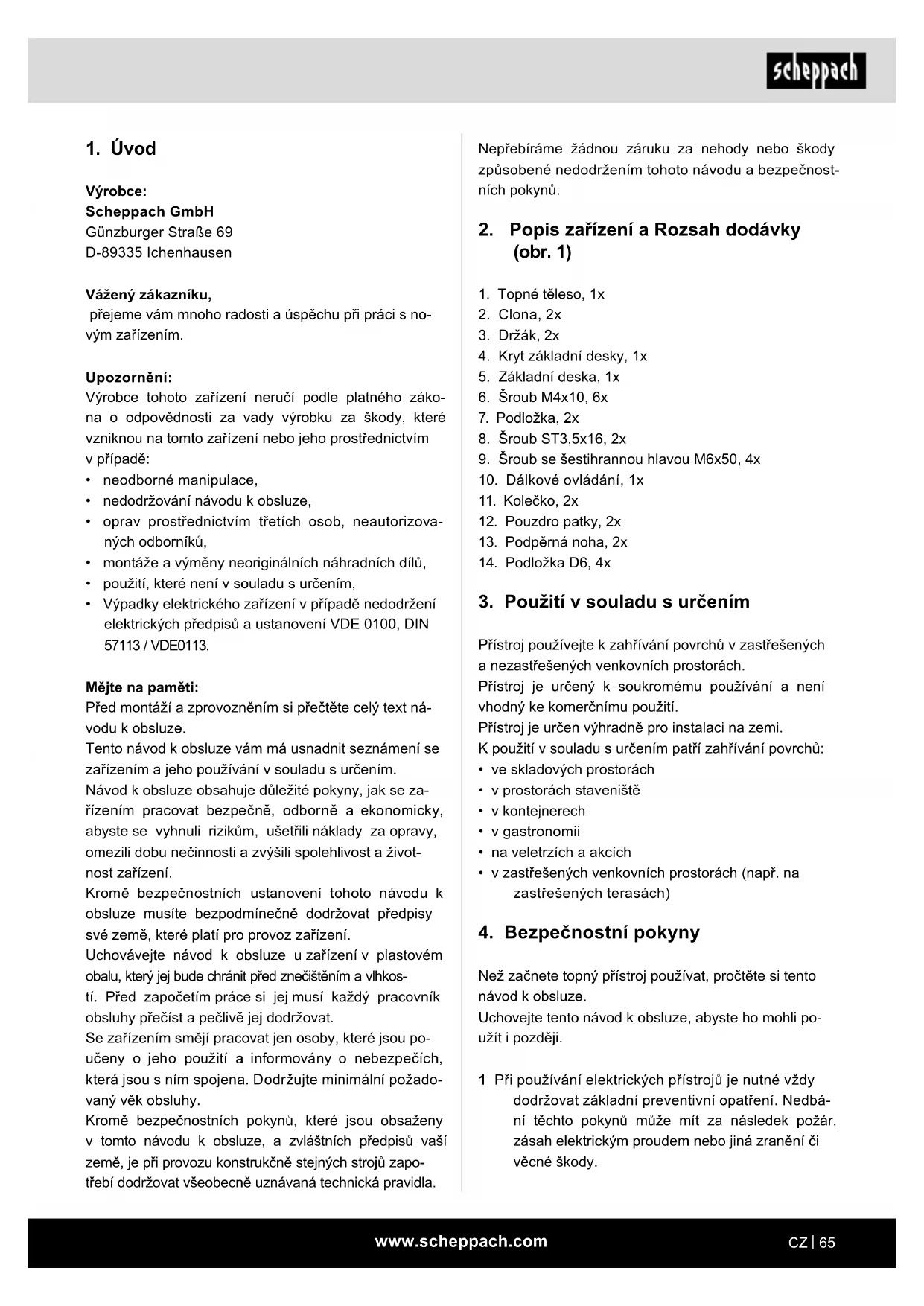 Výrobce: Scheppach GmbH Günzburger Straße 69 D-89335 Ichenhausen Vážený zákazníku, přejeme vám mnoho radosti a úspěchu při práci s no- vým zařízením. Upozornění: Výrobce tohoto zařízení neručí podle platného záko- na o odpovědnosti za vady výrobku za škody, které vzniknou na tomto zařízení nebo jeho prostřednictvím v případě: