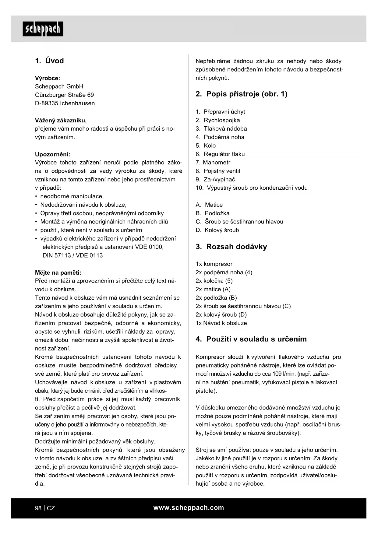 Výrobce: Scheppach GmbH Günzburger Straße 69 D-89335 Ichenhausen Vážený zákazníku, přejeme vám mnoho radosti a úspěchu při práci s no- vým zařízením. Upozornění: Výrobce tohoto zařízení neručí podle platného záko- na o odpovědnosti za vady výrobku za škody, které vzniknou na tomto zařízení nebo jeho prostřednictvím v případě: