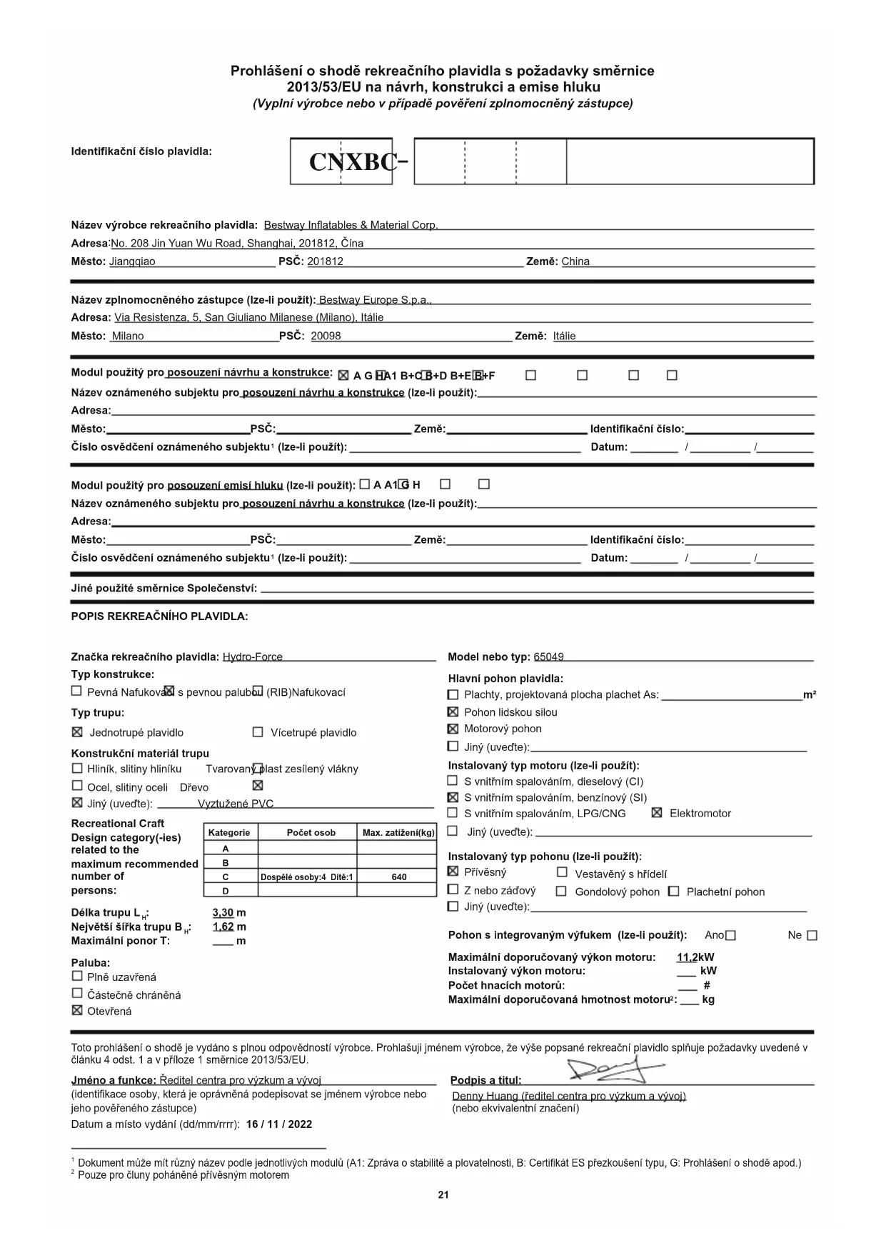 Pouze pro čluny poháněné přívěsným motorem Denny Huang (ředitel centra pro výzkum a vývoj) (nebo ekvivalentní značení)Zaškrtněte na každém řádku pouze jedno políčko Všechny řádky napravo od zaškrtnutých políček musí být vyplněny Základní požadavky (odkazy na příslušné články v příloze IA a IC směrnice) Harmonizované normy Plné použití Jiné referenční dokumenty