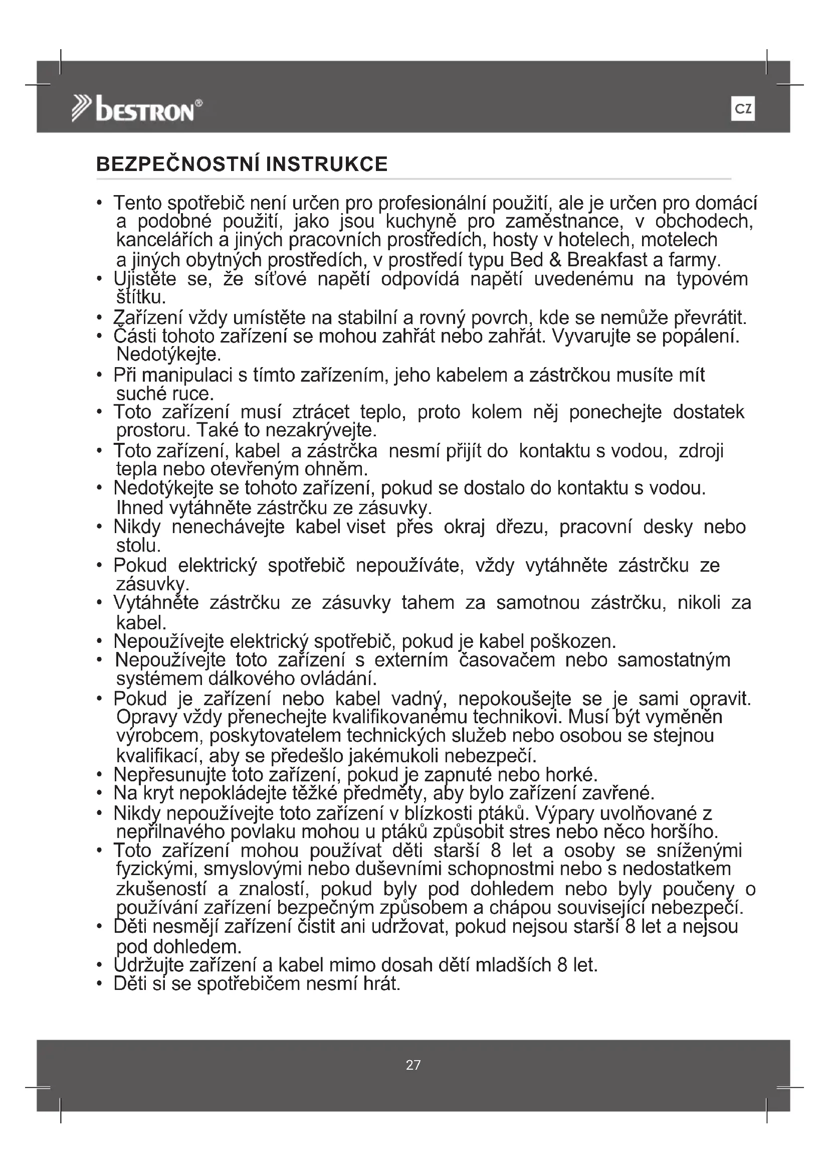 - Vaše obec vám může sdělit, kde ve vaší oblasti najdete určené sběrné místo odpadu. PRÁCE V nepravděpodobném případě poruchy kontaktujte zákaznický servis Bestron: www.bestron.com/service Technické specifikace Modelka AAW700 Napájení (V) 220-240V Frekvence (Hz) 50/60 Bezpečnostní třída 1 Výkon (W) 700 Hlučnost (dB(A)) - Maximální kapacita - Maximální doba nepřetržitého provádění KB - Rozměry (D x Š x V) (cm) 29,5x46,7x24,5 Délka kabelu (cm) 75CZ