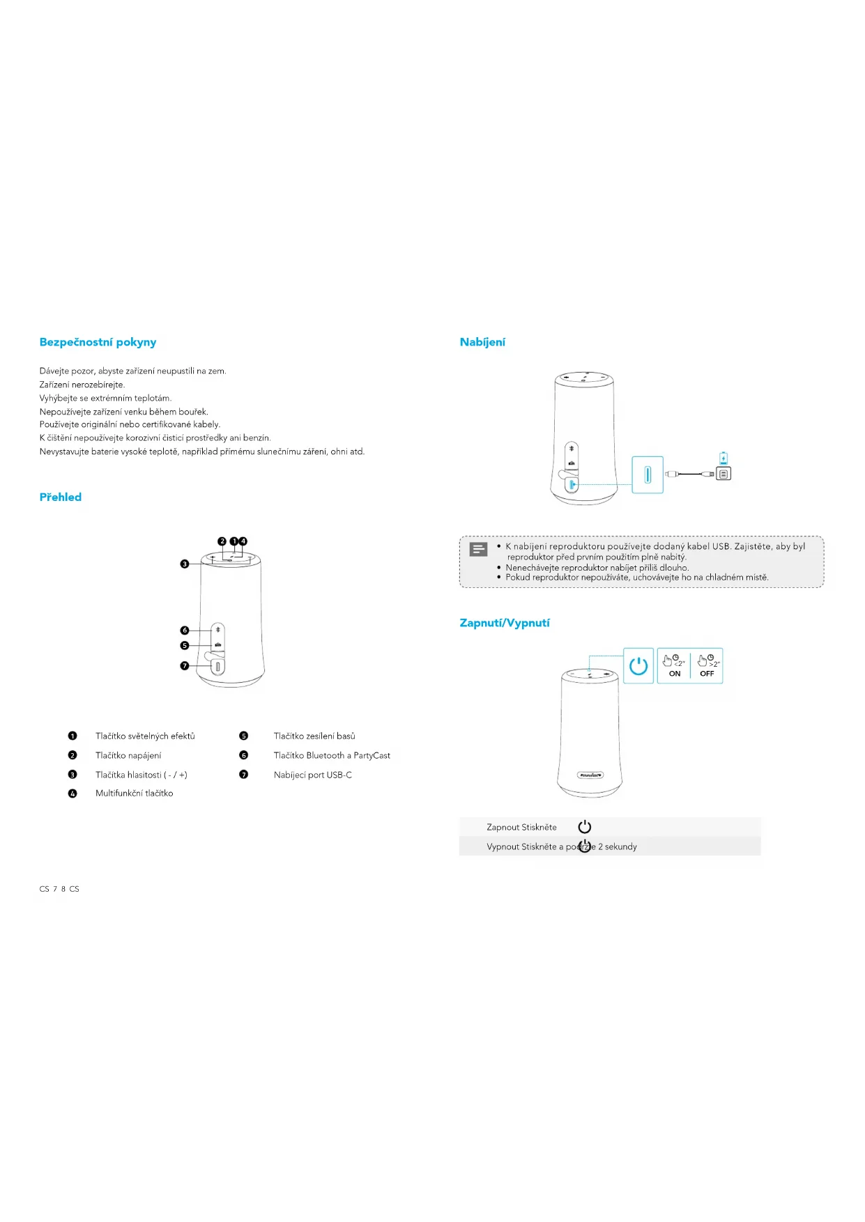 Press Turn off >2” Press and hold for 2 seconds Soundcore App Download the Soundcore App for light effects, EQ settings, rmware update and more. Soundcore Apple and the Apple logo are trademarksof Apple Inc.Google Play and the Google Play logo are trademarks of Google Inc. Specifications Specications are subject to change without notice. Input 5 V 2 A Rated output power 2 x 10 W Battery capacity 2600 mAh, 7.4 V Charging time 3.5 hours Playtime (varies by volume level and content) 12 hours Frequency response 50 Hz - 20 kHz Bluetooth version V 5.0 Bluetooth range 20 m / 66 ftCS 7 8 CS Bezpečnostní pokyny Dávejte pozor, abyste zařízení neupustili na zem. Zařízení nerozebírejte. Vyhýbejte se extrémním teplotám. Nepoužívejte zařízení venku během bouřek. Používejte originální nebo certikované kabely. K čištění nepoužívejte korozivní čisticí prostředky ani benzín. Nevystavujte baterie vysoké teplotě, například přímému slunečnímu záření, ohni atd. Přehled