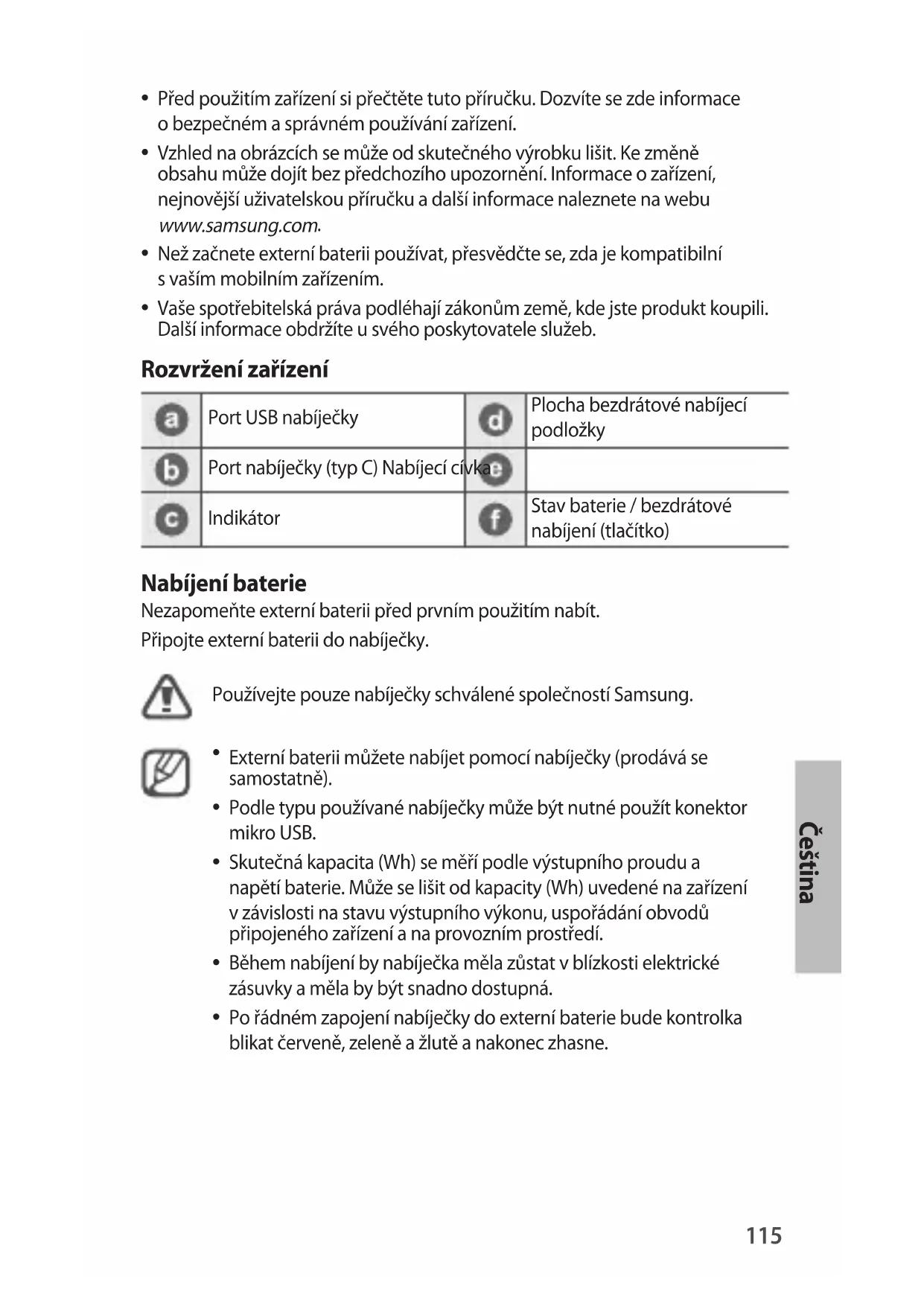 Vzhled na obracchia se muze od skutecného vyrobku lisit. Ke zmene obsahu muze dojit bez predchoziho upozorneni. Informace o zaizeni,nejnovejsi uživatelskou priručku a dalsí informace naleznete na webu www.samsung.com. - Než začnete externí baterii používat, prěsvěděcte se, zda je kompatibilnís vaším mobilním zařizením.