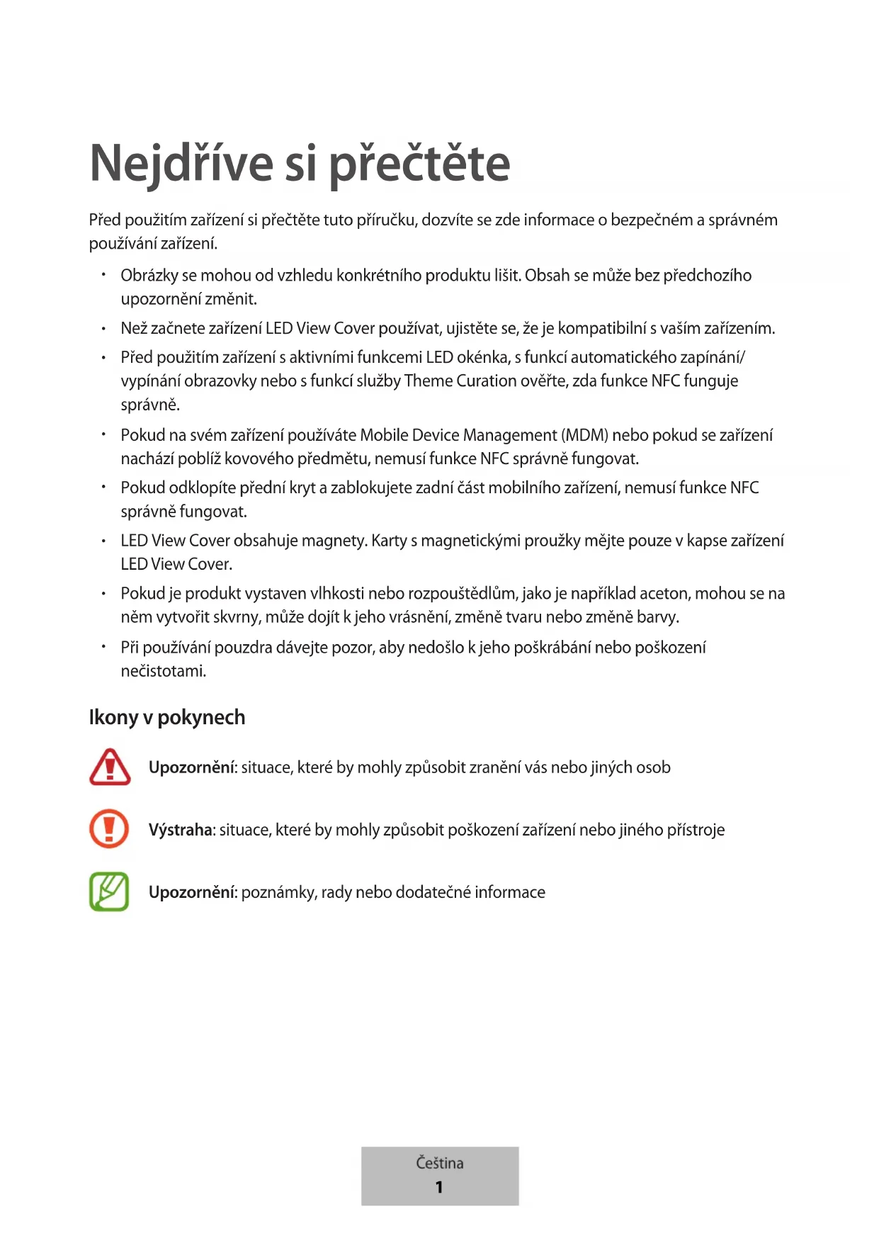 Při používání pouzdra dávejte pozor, aby nedošlo kjeho poškrábání nebo poškození nečistotami. Ikony v pokynech Upozornění: situace, které by mohly způsobit zranění vás nebo jiných osob Výstraha: situace, které by mohly způsobit poškození zařízení nebo jiného přístroje Upozornění: poznámky, rady nebo dodatečné informace Čeština