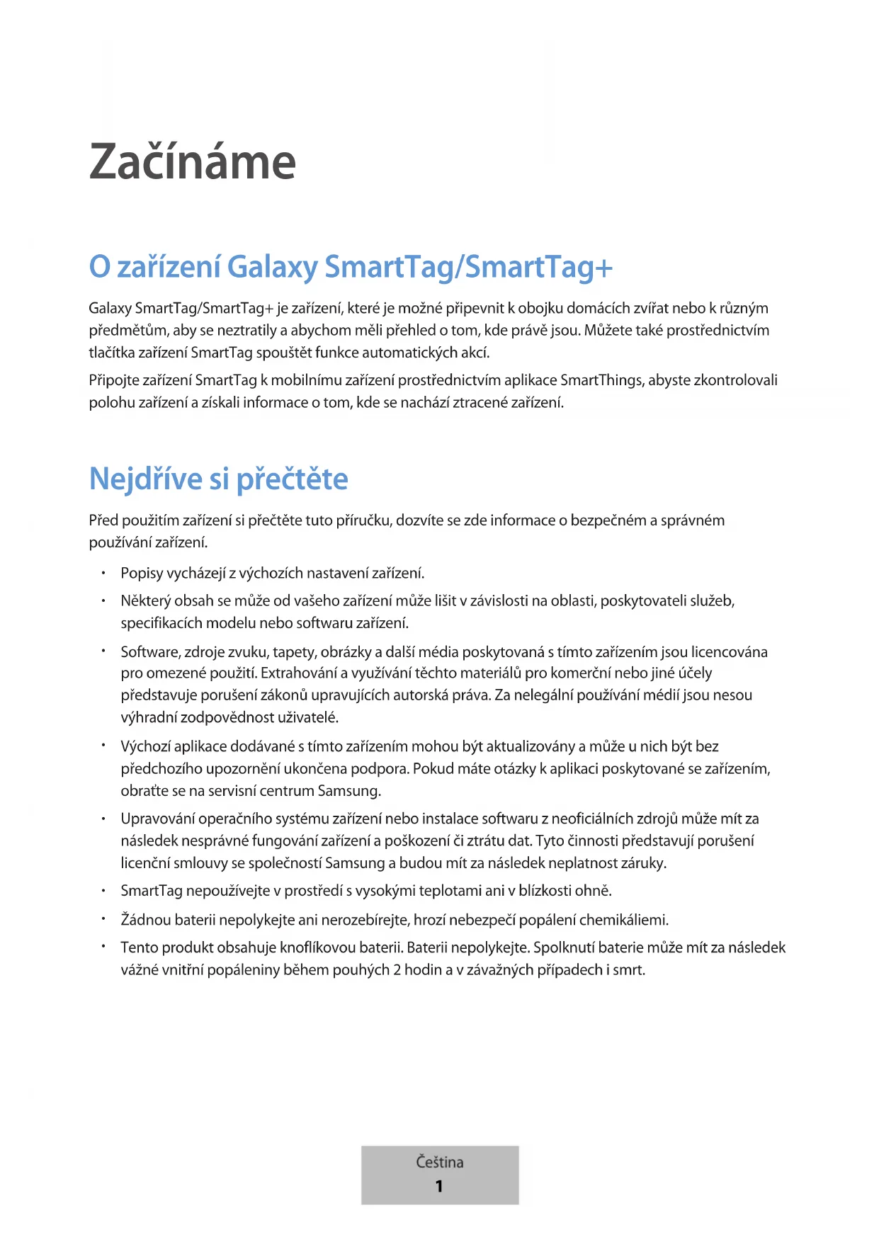 Začínáme Ozařízení Galaxy SmartTag/SmartTag+ Galaxy SmartTag/SmartTag+ je zařízení, které je možné připevnit kobojku domácích zvířat nebo krůzným předmětům, aby se neztratily a abychom měli přehled o tom, kde právě jsou. Můžete také prostřednictvím tlačítka zařízení SmartTag spouštět funkce automatických akcí. Připojte zařízení SmartTag kmobilnímu zařízení prostřednictvím aplikace SmartThings, abyste zkontrolovali polohu zařízení a získali informace otom, kde se nachází ztracené zařízení. Nejdříve si přečtěte Před použitím zařízení si přečtěte tuto příručku, dozvíte se zde informace o bezpečném a správném používání zařízení.
