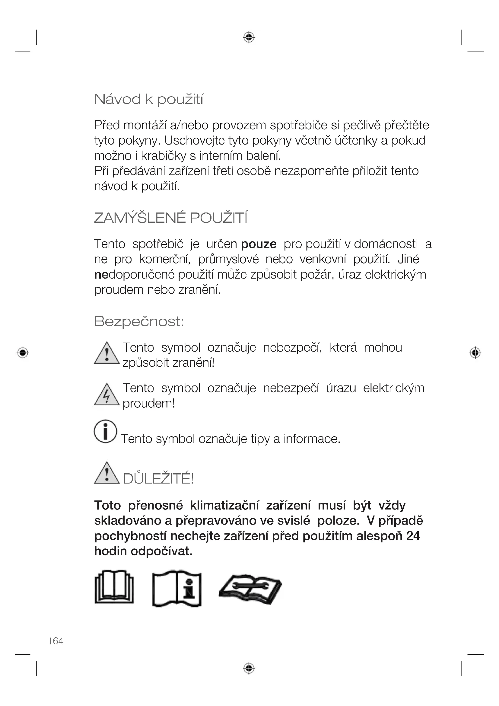 Tento spotřebič je určen pouze pro použití v domácnosti a ne pro komerční, průmyslové nebo venkovní použití. Jiné nedoporučené použití může způsobit požár, úraz elektrickým proudem nebo zranění. Bezpečnost: Tento symbol označuje nebezpečí, která mohou způsobit zranění! Tento symbol označuje nebezpečí úrazu elektrickým proudem! Tento symbol označuje tipy a informace. DŮLEŽITÉ! Toto přenosné klimatizační zařízení musí být vždy skladováno a přepravováno ve svislé poloze. V případě pochybností nechejte zařízení před použitím alespoň 24 hodin odpočívat.ČESKÝ Návod k použití