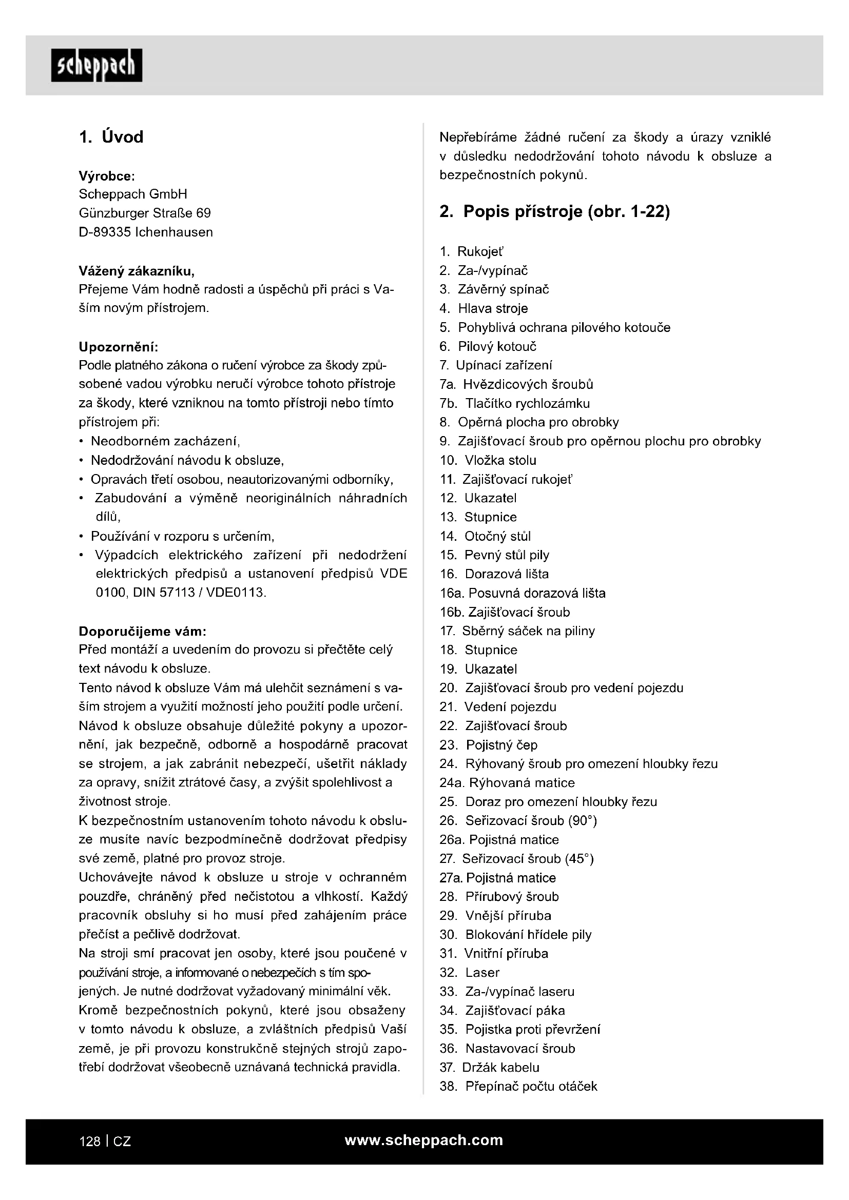 Výrobce: Scheppach GmbH Günzburger Straße 69 D-89335 Ichenhausen Vážený zákazníku, Přejeme Vám hodně radosti a úspěchů při práci s Va- ším novým přístrojem. Upozornění: Podle platného zákona o ručení výrobce za škody způ- sobené vadou výrobku neručí výrobce tohoto přístroje za škody, které vzniknou na tomto přístroji nebo tímto přístrojem při: