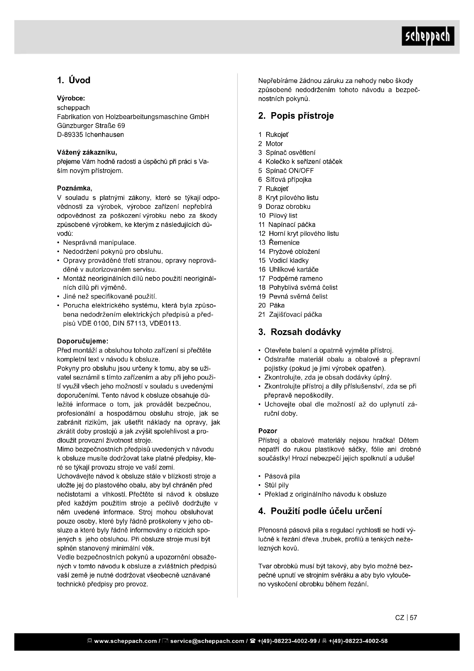 Výrobce: scheppach Fabrikation von Holzbearbeitungsmaschine GmbH Günzburger Straße 69 D-89335 Ichenhausen Vážený zákazníku, přejeme Vám hodně radosti a úspěchů při práci s Va- ším novým přístrojem. Poznámka, V souladu s platnými zákony, které se týkají odpo- vědnosti za výrobek, výrobce zařízení nepřebírá odpovědnost za poškození výrobku nebo za škody způsobené výrobkem, ke kterým z následujících dů- vodů: