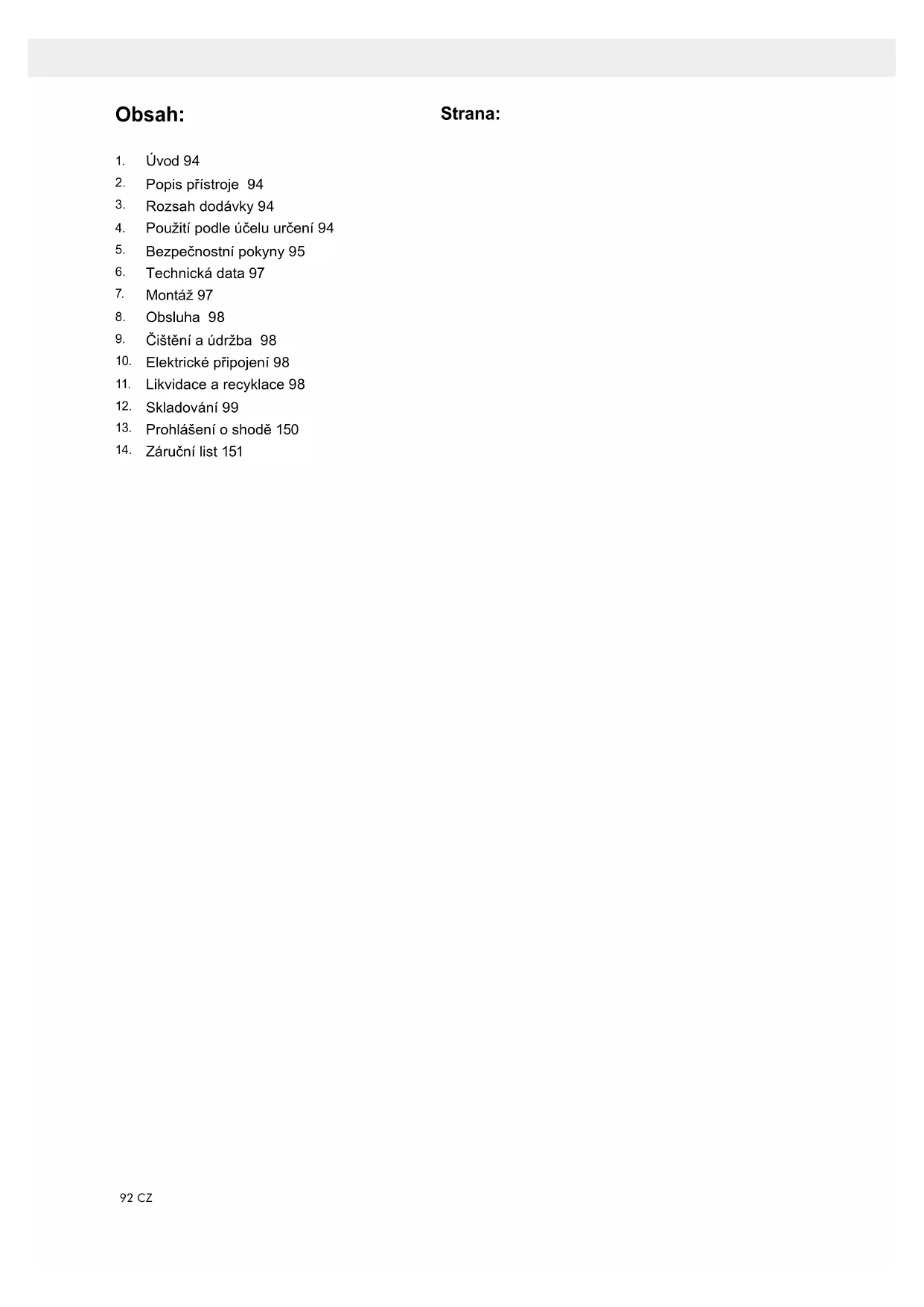 Skladujte přístroj a jeho příslušenství na tmavém, suchém a nezamrzajícím místě a mimo dosah dětí. Optimální teplota skladování leží mezi 5 a 30 ˚C. Uložte elektrický přístroj v originálním balení.100 SK Obsah: Strana: