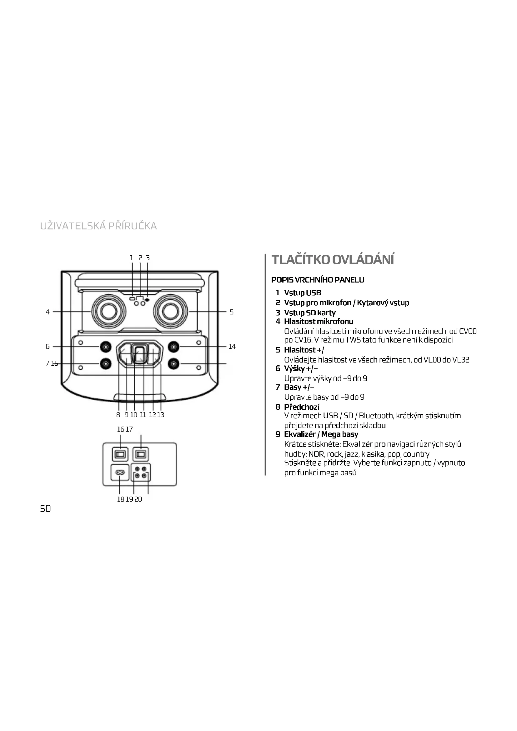 Vstup USB Vstup pro mikrofon / Kytarový vstup Vstup SD karty Hlasitost mikrofonu Ovládání hlasitosti mikrofonu ve všech režimech, od CV00 po CV16. V režimu TWS tato funkce není k dispozici Hlasitost +/– Ovládejte hlasitost ve všech režimech, od VL00 do VL32 Výšky +/– Upravte výšky od –9 do 9 Basy +/– Upravte basy od –9 do 9 Předchozí V režimech USB / SD / Bluetooth, krátkým stisknutím přejdete na předchozí skladbu Ekvalizér / Mega basy Krátce stiskněte: Ekvalizér pro navigaci různých stylů hudby: NOR, rock, jazz, klasika, pop, country Stiskněte a přidržte: Vyberte funkci zapnuto / vypnuto pro funkci mega basů
