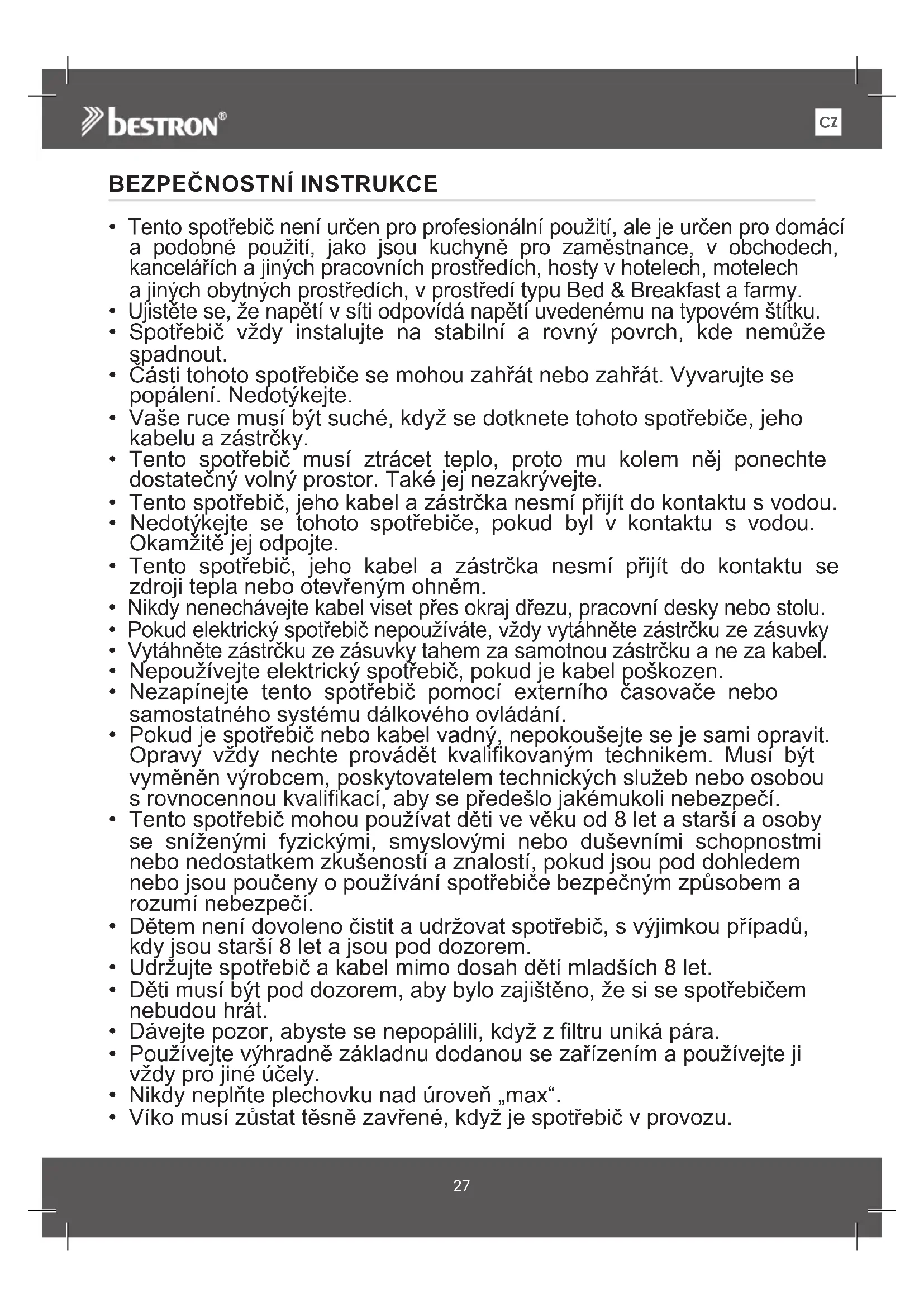 - Vaše obec vám může sdělit, kde najdete určené sběrné místo odpadu ve vašem okolí. SERVIS V nepravděpodobném případě poruchy kontaktujte zákaznický servis Bestron: www.bestron.com/service Technické specifikace Modelka ACM900BW Síťová 220-240V~ Frekvence (Hz) 50/60 Bezpečnostní třída 1 Napájení (Watt) 1000 Hluk (dB(A)) - Max. Kapacita - Maximální doba nepřetržitého provozu (KB) - Rozměry (D x Š x V) (cm) 24,6x16,6x34,2 Délka kabelu (cm) 93CZ