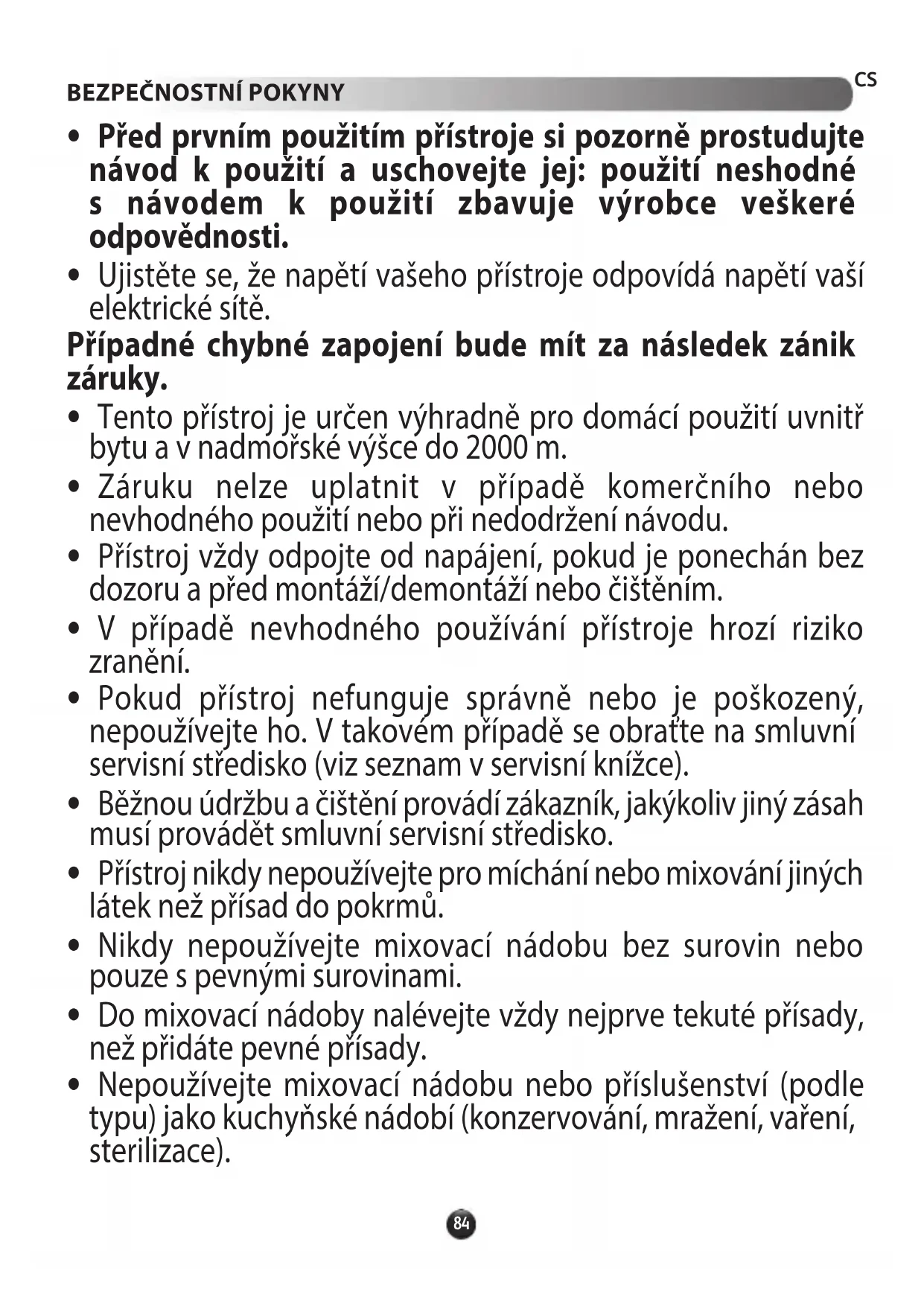 - Přístroj nikdy nepoužívejte pro míchání nebo mixování jiných látek než přísad do pokrmů.