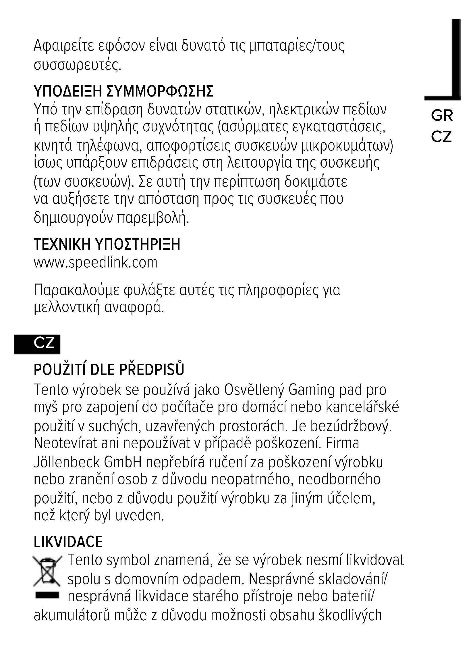 Za působení silných statických, elektrických, nebo vysokofrekvenčních polí (rádiová zařízení, mobilní telefony, mikrovlnné výboje) může dojít k omezení funkčnosti přístroje (přístrojů). V takovém případě se pokuste zvětšit distanci k rušivým přístrojům. TECHNICKÝ SUPORT www.speedlink.com Tyto informace uchovejte pro budoucí potřebu.