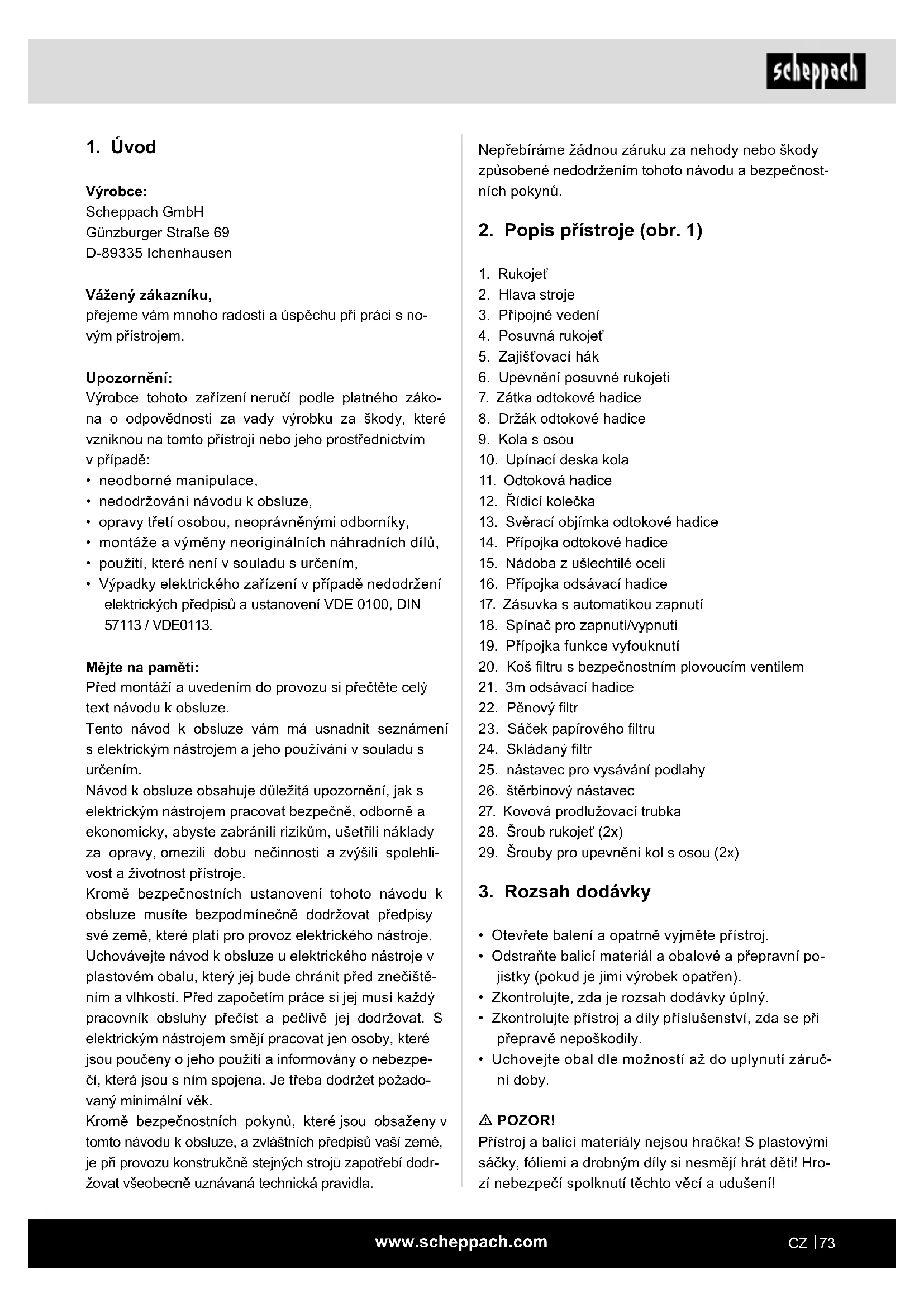 Výrobce: Scheppach GmbH Günzburger Straße 69 D-89335 Ichenhausen Vážený zákazníku, přejeme vám mnoho radosti a úspěchu při práci s no- vým přístrojem. Upozornění: Výrobce tohoto zařízení neručí podle platného záko- na o odpovědnosti za vady výrobku za škody, které vzniknou na tomto přístroji nebo jeho prostřednictvím v případě: