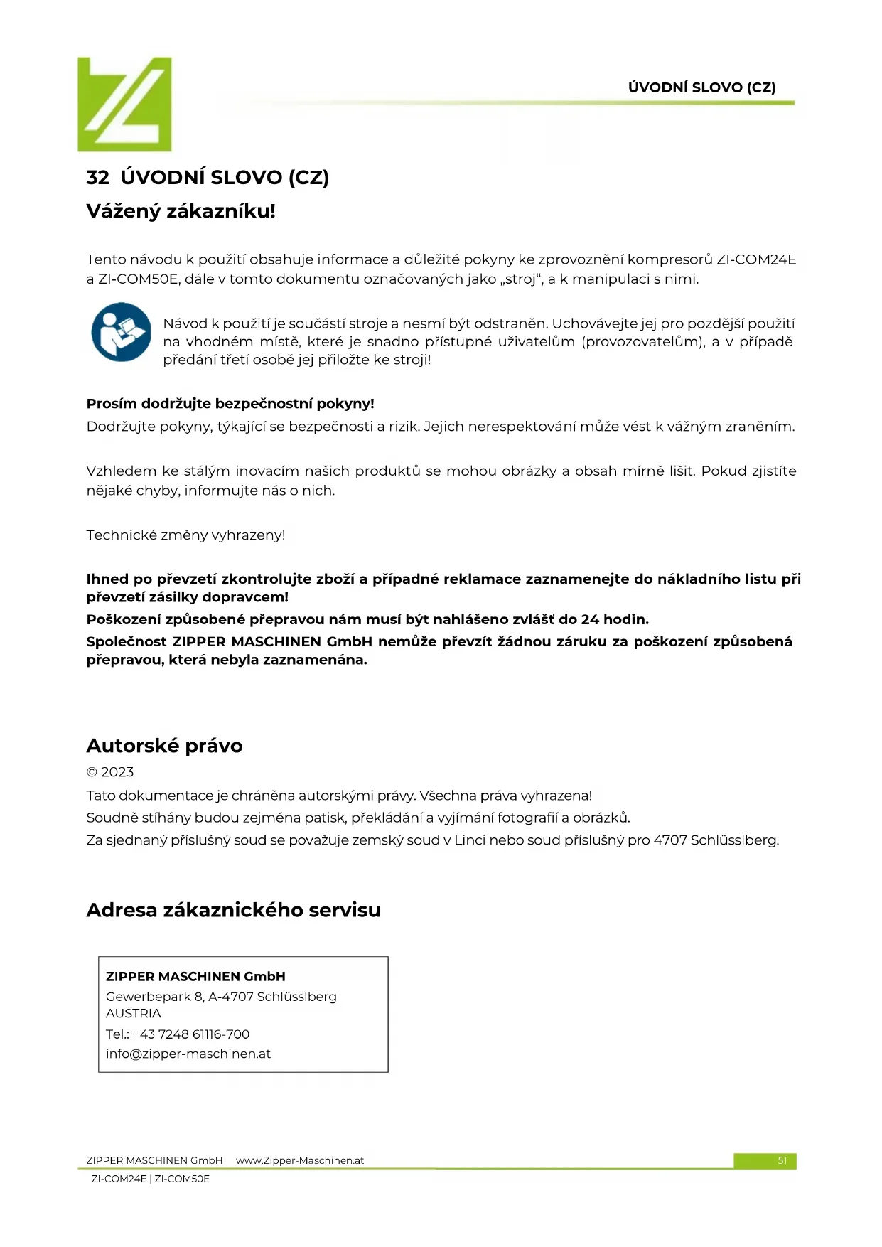 Použití v Rozporu s určením, resp. nerespektováni vykladu aPokynú, uvedených v toto navodu, bude mít za následek zánik veškerých nároku vúči společnosti ZIPPER MASCHINEN GmbH na poskytnú táruky a nahrady skody.