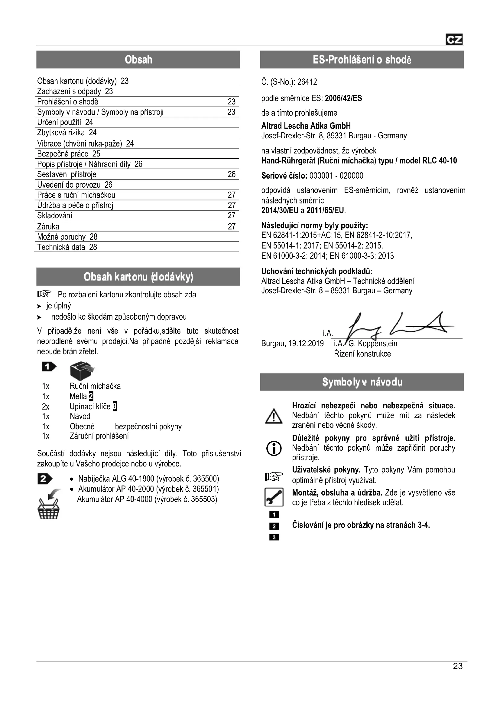 Č. (S-No.): 26412 podle směrnice ES: 2006/42/ES de a tímto prohlašujeme Altrad Lescha Atika GmbH Josef-Drexler-Str. 8, 89331 Burgau - Germany na vlastní zodpovědnost, že výrobek Hand-Rührgerät (Ruční míchačka) typu / model RLC 40-10 Seriové číslo: 000001 - 020000 odpovídá ustanovením ES-směrnicím, rovněž ustanovením následných směrnic: 2014/30/EU a 2011/65/EU. Následující normy byly použity: EN 62841-1:2015+AC:15, EN 62841-2-10:2017, EN 55014-1: 2017; EN 55014-2: 2015, EN 61000-3-2: 2014; EN 61000-3-3: 2013 Uchování technických podkladů: Altrad Lescha Atika GmbH – Technické oddělení Josef-Drexler-Str. 8 – 89331 Burgau – Germany