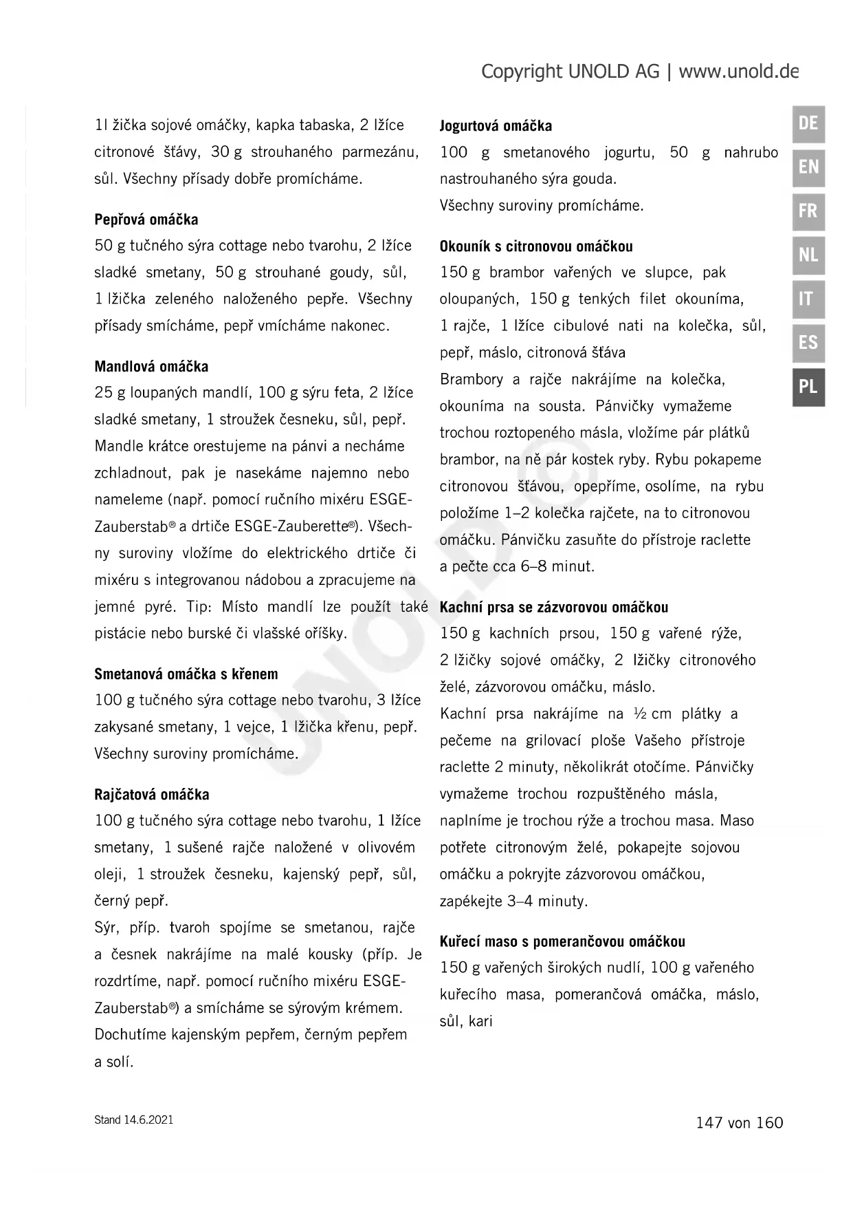 Do pánviček nalijeme troche rozpuštěného más- la, vložíme těstoviny a maso, dochutíme kari, solí a pepřem. Vše přelijeme pomerančovou om- áčkou a dáme zapéct na 3–4minuty. Špenát s mandlovou omáčkou 100 g listového špenátu (zmraženého), ½ cibule, 1 stroužek česneku, 1 lžička másla, 150 g ve slupce vařených loupaných brambor, sůl, pepř, muškátový oříšek, máslo Očistíme cibuli a česnek a pokrájíme je nadrobno. Necháme zesklovatět na másle, přidáme listový špenát a občas pomalu promícháme, dokud se špenát nerozmrazí a neprohřeje. Do pánviček nalijeme troche rozpuštěného másla, vložíme pár koleček brambor, špenát ochucený solí, pepřem a muškátovým oříškem, zalijeme mandlovou omáčkou a dáme zapéct asi na 3-–4 minuty. Telecí játra s jablky a jogurtovou omáčkou 150 g telecích jater, 1 jablko, ½ cibule, 150 g bramborového pyré (polotovar), 2 lžičky brusinek, 2 lžička oleje, jogurtová omáčka. Játru nakrájejte na tenké, ke konzumaci vhodné kousky, jablko oloupejte, odstraňte jádřinec, nakrájejte na plátky, oloupejte cibuli, nakrájejte na tenké plátky. Grilovací desku potřete trochou oleje a játru, jablko a cibuli opékejte s otáčením krátce 1-2 minuty. 1-2 lžíce bramborového pyré vložte do vymazané pánvičky, nato trochu opečených přísad. Vše přelijeme trochou jogurtové omáčky a dame zapéct na 3 minuty. Podáváme s brusinkami. Uzený losos se smetanovo-křenovou omáčkou 150 g chřestu (sterilovaného), 100 g uzeného lososa, máslo Pánvičky zlehka potřeme máslem, vložíme do nich několik kousků chřestu, pak dílky uzeného lososa a přelijeme smetano v o křenovou omáčkou. Zapékat 5-7 minut. K tomu se hodí bílý chléb, který opečete na grilu. Brambory, cukety, šunka s pepřovou omáčkou 100 g brambor vařených ve slupce, pak oloupaných, 100 g drobné cukety nakrájené na kolečka, 100 g dušené šunky nakrájené na nudličky, trocha másla, sůl, pepř Pánvičky potřeme máslem, krátce v nich osmahneme kolečka cukety (asi 2 minuty z každé strany) a pak k nim přidáme několik koleček brambor. Přidáme šunku, okořeníme, přelijeme pepřovou omáčkou a necháme zapéct asi 3–4 minuty. Garnáti s rajčatovou omáčkou 100 g vařených garnátů (ze sklenice), 100 g cukety na plátky, trocha olivového oleje, 100 g vařené růže, rajčatová omáčka Garnáty a plátky cukety 2 minuty péct na neolejované grilovací desce, často otáčet. Do pánvičky vymazané máslem dejte troche rýže, na ni garnáty a cuketu, navrch rajčatovou omáčku a zapékejte 3–4 minuty. Brambory s česnekovou omáčkou 200 g brambor vařených ve slupce, pak oloupaných česneková omáčka, máslo Pánvičky potřeme máslem a z poloviny je napl- níme kolečky brambor, přelijeme česnekovou omáčkou a necháme na 3–4 minuty zapéct. Copyright UNOLD AG | www.unold.de UNOLD ©Stand 14.6.2021 149 von 160