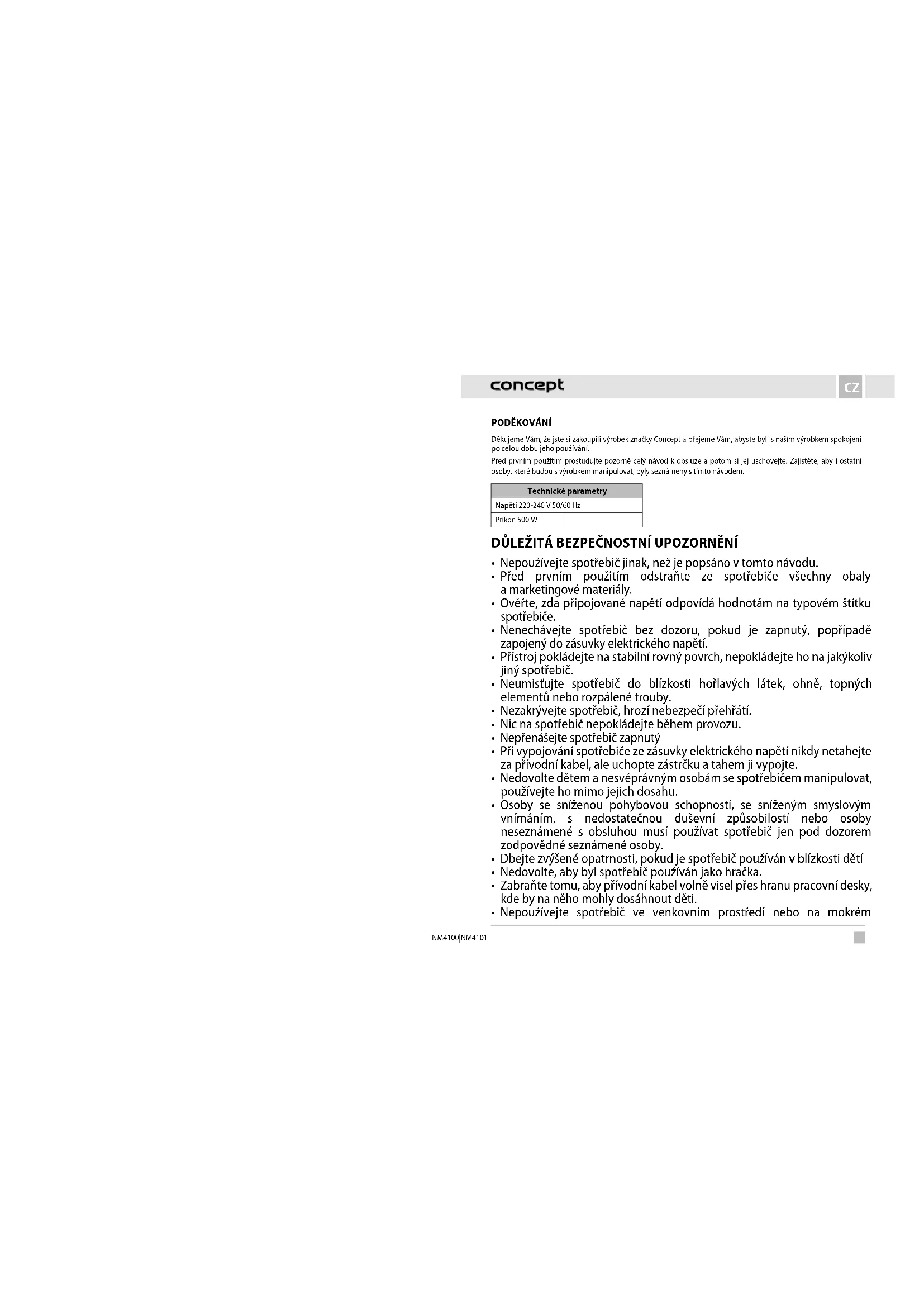 Děkujeme Vám, že jste si zakoupili výrobek značky Concept a přejeme Vám, abyste byli s naším výrobkem spokojeni po celou dobu jeho používání. Před prvním použitím prostudujte pozorně celý návod k obsluze a potom si jej uschovejte. Zajistěte, aby i ostatní osoby, které budou s výrobkem manipulovat, byly seznámeny s tímto návodem. Technické parametry Napětí 220-240 V 50/60 Hz Příkon 500 W DŮLEŽITÁ BEZPEČNOSTNÍ UPOZORNĚNÍ