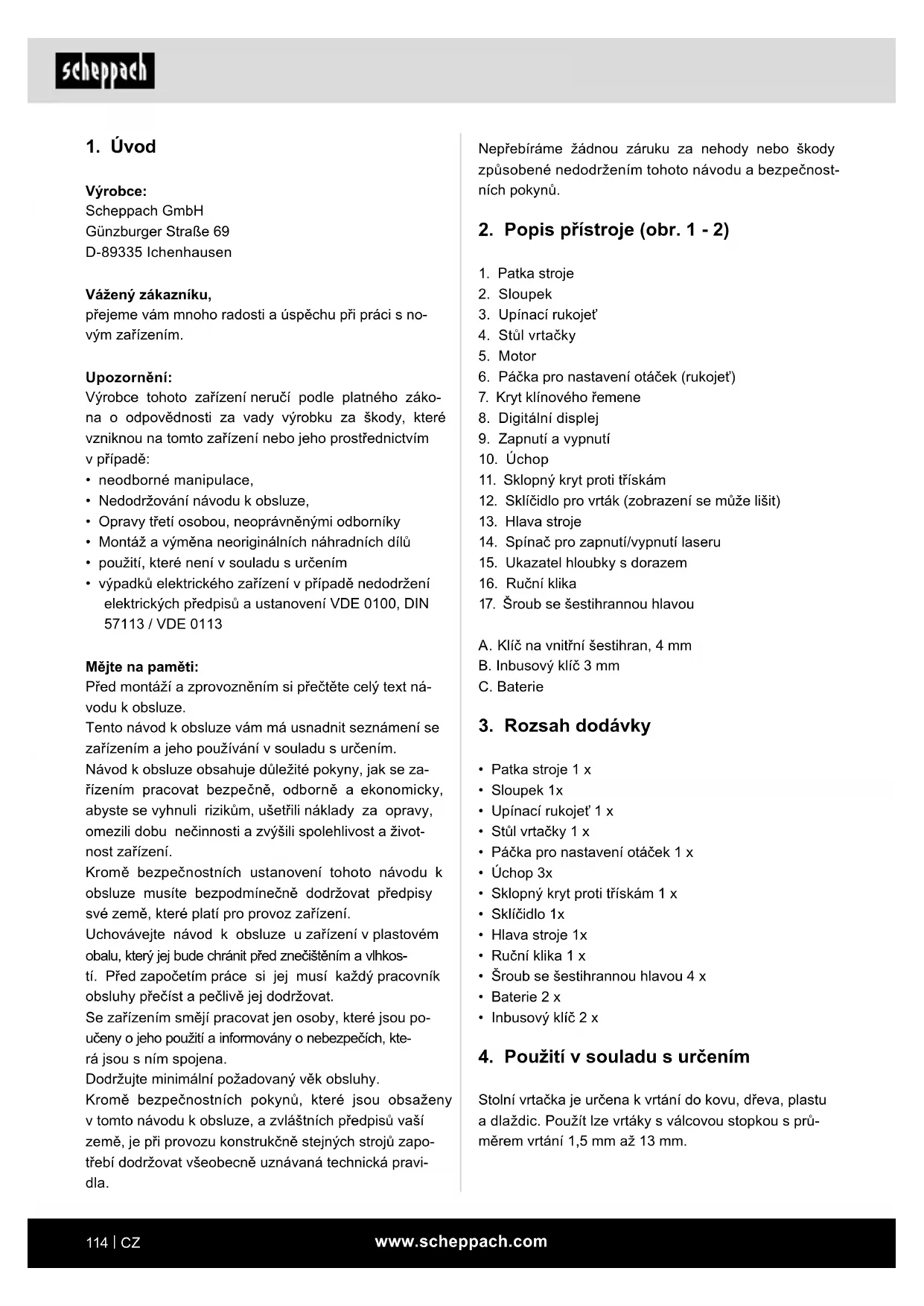 Výrobce: Scheppach GmbH Günzburger Straße 69 D-89335 Ichenhausen Vážený zákazníku, přejeme vám mnoho radosti a úspěchu při práci s no- vým zařízením. Upozornění: Výrobce tohoto zařízení neručí podle platného záko- na o odpovědnosti za vady výrobku za škody, které vzniknou na tomto zařízení nebo jeho prostřednictvím v případě: