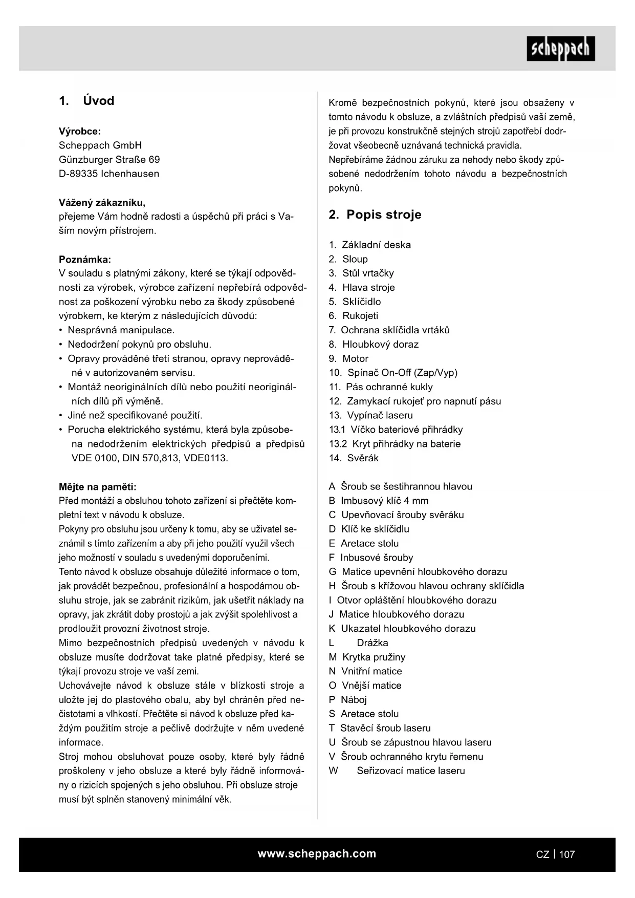 - Porucha elektrického systému, která byla způsobe- na nedodržením elektrických předpisů a předpisů VDE 0100, DIN 570,813, VDE0113. Mějte na paměti: Před montáží a obsluhou tohoto zařízení si přečtěte kom- pletní text v návodu k obsluze. Pokyny pro obsluhu jsou určeny k tomu, aby se uživatel se- známil s tímto zařízením a aby při jeho použití využil všech jeho možností v souladu s uvedenými doporučeními. Tento návod k obsluze obsahuje důležité informace o tom, jak provádět bezpečnou, profesionální a hospodárnou ob- sluhu stroje, jak se zabránit rizikům, jak ušetřit náklady na opravy, jak zkrátit doby prostojů a jak zvýšit spolehlivost a prodloužit provozní životnost stroje. Mimo bezpečnostních předpisů uvedených v návodu k obsluze musíte dodržovat take platné předpisy, které se týkají provozu stroje ve vaší zemi. Uchovávejte návod k obsluze stále v blízkosti stroje a uložte jej do plastového obalu, aby byl chráněn před ne- čistotami a vlhkostí. Přečtěte si návod k obsluze před ka- ždým použitím stroje a pečlivě dodržujte v něm uvedené informace. Stroj mohou obsluhovat pouze osoby, které byly řádně proškoleny v jeho obsluze a které byly řádně informová- ny o rizicích spojených s jeho obsluhou. Při obsluze stroje musí být splněn stanovený minimální věk.www.scheppach.com