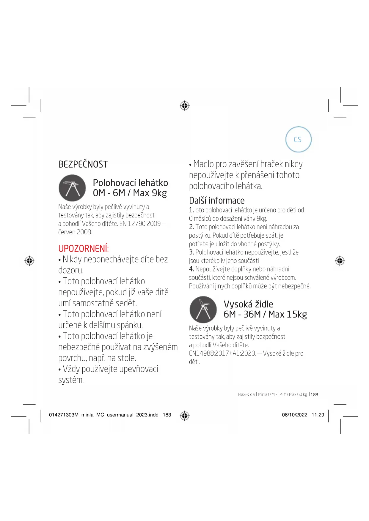 BEZPEČNOST Polohovací lehátko 0M - 6M / Max 9kg Naše výrobky byly pečlivě vyvinuty a testovány tak, aby zajistily bezpečnost a pohodlí Vašeho dítěte. EN 12790:2009 — červen 2009. UPOZORNENÍ: