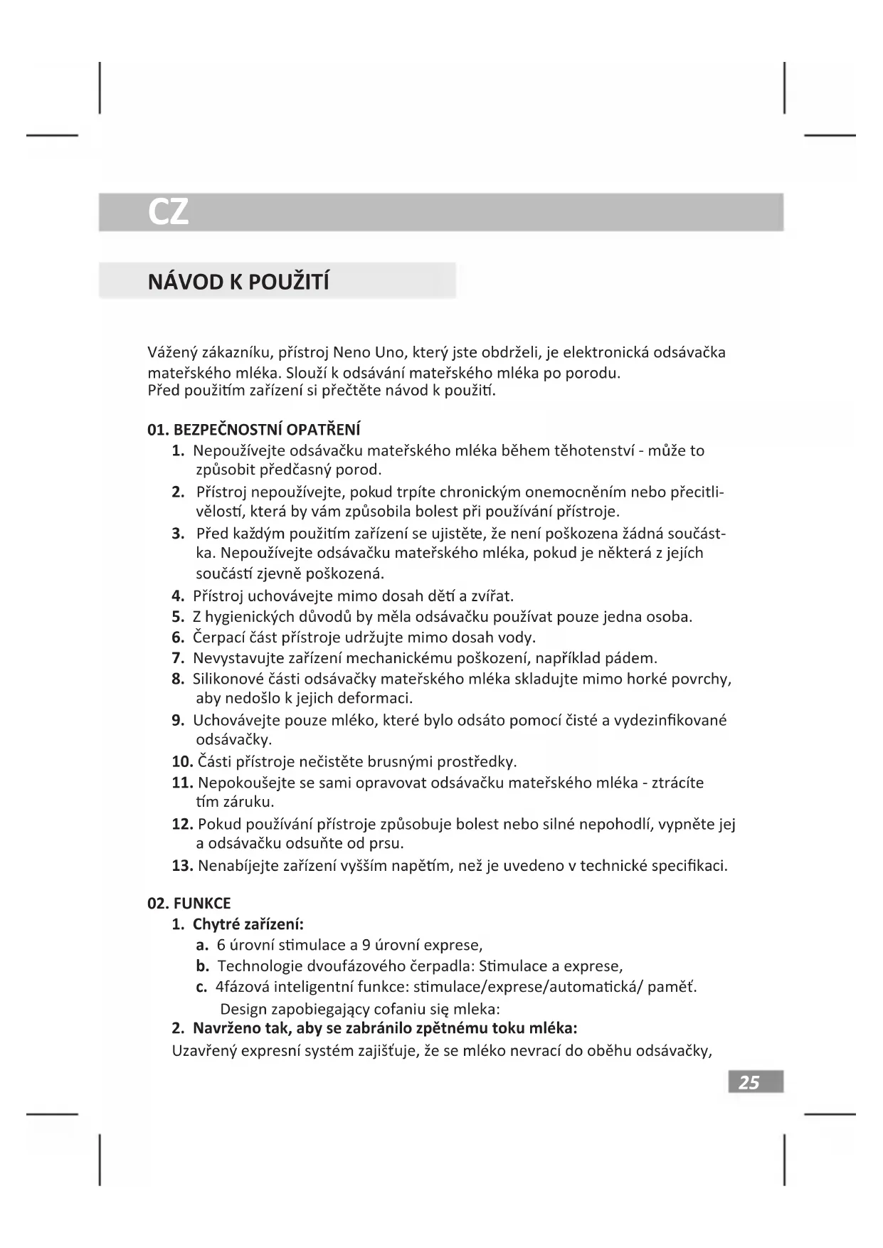 Vážený zákazníku, přístroj Neno Uno, který jste obdrželi, je elektronická odsávačka mateřského mléka. Slouží k odsávání mateřského mléka po porodu. Před použim zařízení si přečtěte návod k použi.