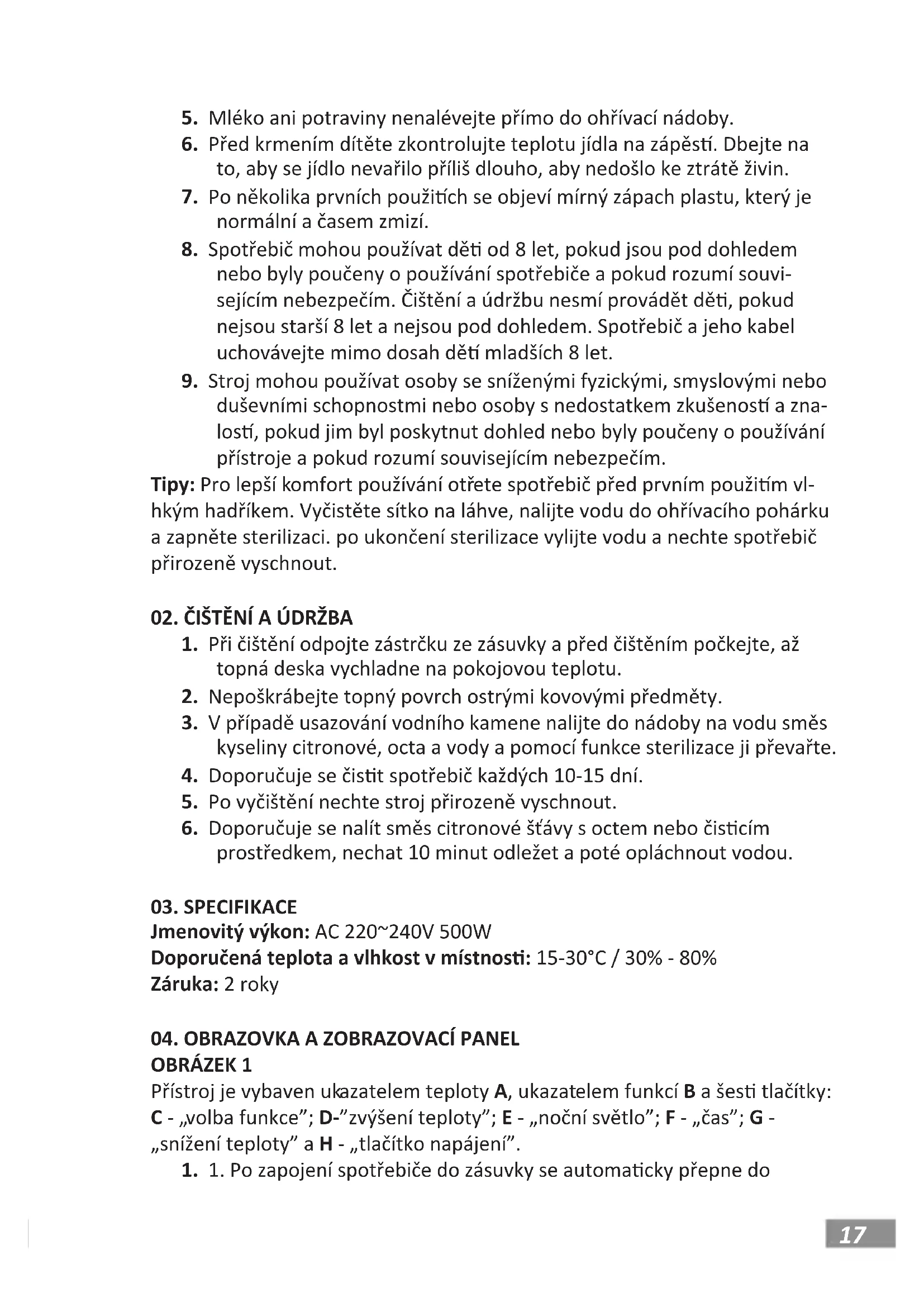duševními schopnostmi nebo osoby s nedostatkem zkušenos a zna- los, pokud jim byl poskytnut dohled nebo byly poučeny o používání přístroje a pokud rozumí souvisejícím nebezpečím. Tipy: Pro lepší komfort používání otřete spotřebič před prvním použim vl- hkým hadříkem. Vyčistěte sítko na láhve, nalijte vodu do ohřívacího pohárku a zapněte sterilizaci. po ukončení sterilizace vylijte vodu a nechte spotřebič přirozeně vyschnout.