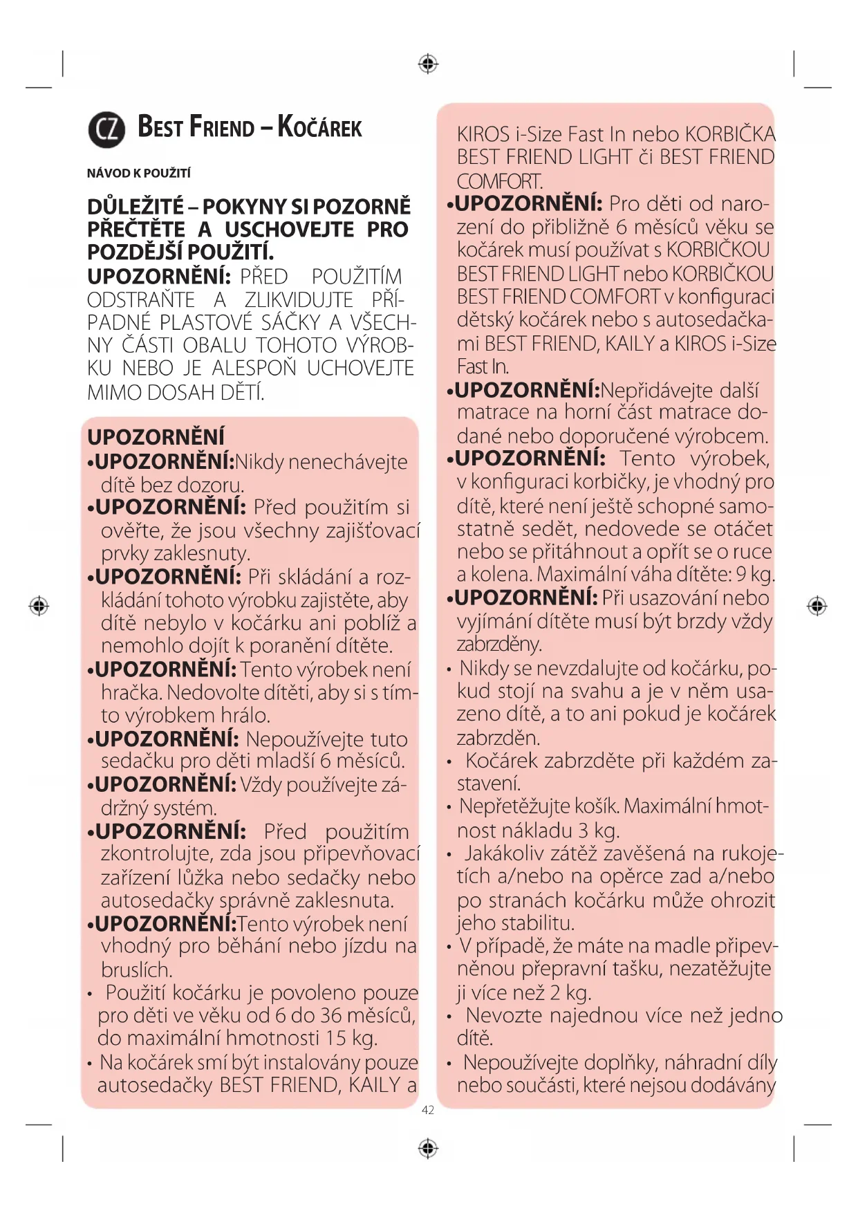 - UPOZORNĚNÍ: Pro děti od naro- zení do přibližně 6 měsíců věku se kočárek musí používat s KORBIČKOU BEST FRIEND LIGHT nebo KORBIČKOU BEST FRIEND COMFORT v konfiguraci dětský kočárek nebo s autosedačka- mi BEST FRIEND, KAILY a KIROS i-Size Fast In.