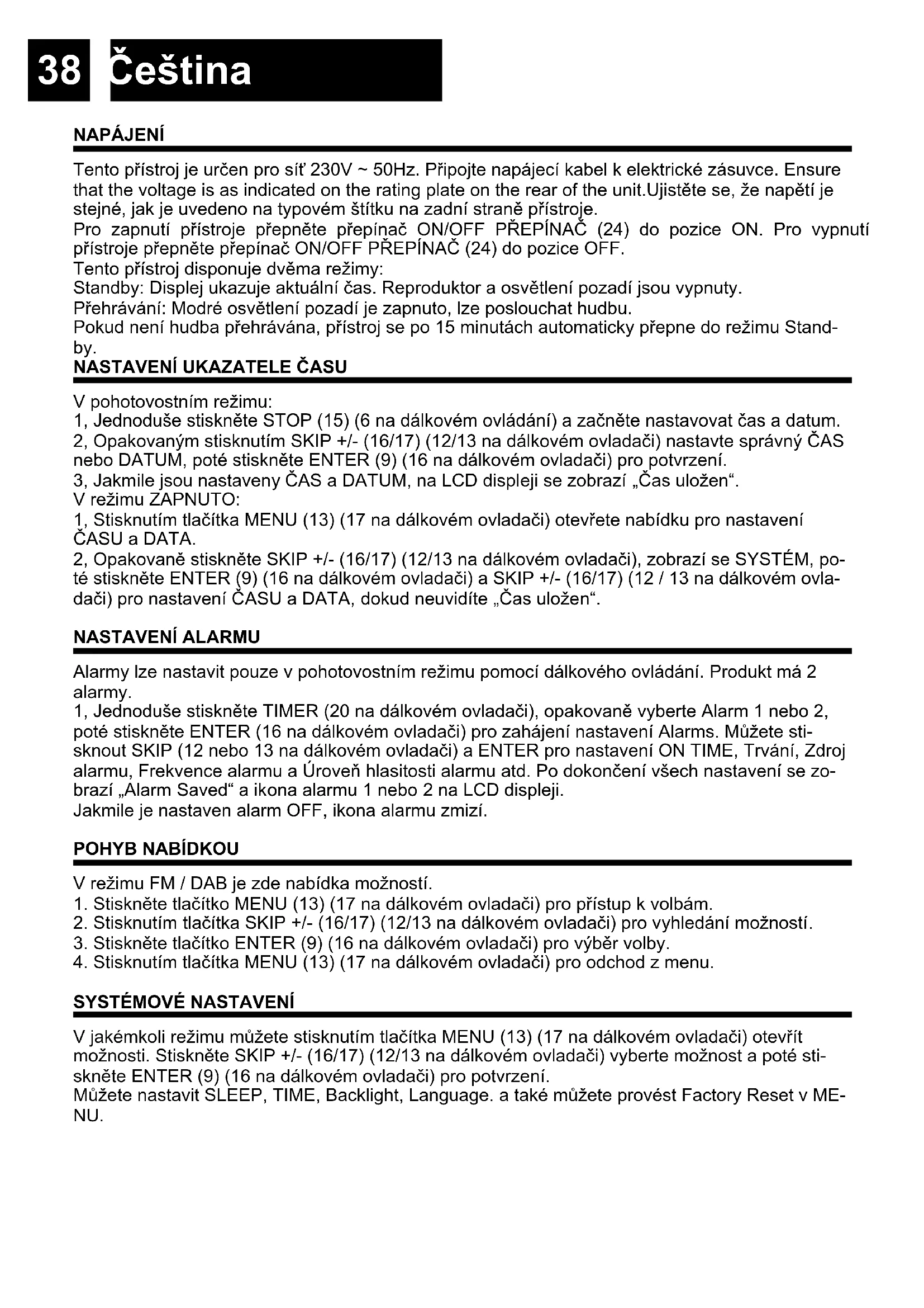 NAPÁJENÍ Tento přístroj je určen pro síť 230V ~ 50Hz. Připojte napájecí kabel k elektrické zásuvce. Ensure that the voltage is as indicated on the rating plate on the rear of the unit.Ujistěte se, že napětí je stejné, jak je uvedeno na typovém štítku na zadní straně přístroje. Pro zapnutí přístroje přepněte přepínač ON/OFF PŘEPÍNAČ (24) do pozice ON. Pro vypnutí přístroje přepněte přepínač ON/OFF PŘEPÍNAČ (24) do pozice OFF. Tento přístroj disponuje dvěma režimy: Standby: Displej ukazuje aktuální čas. Reproduktor a osvětlení pozadí jsou vypnuty. Přehrávání: Modré osvětlení pozadí je zapnuto, lze poslouchat hudbu. Pokud není hudba přehrávána, přístroj se po 15 minutách automaticky přepne do režimu Stand- by.