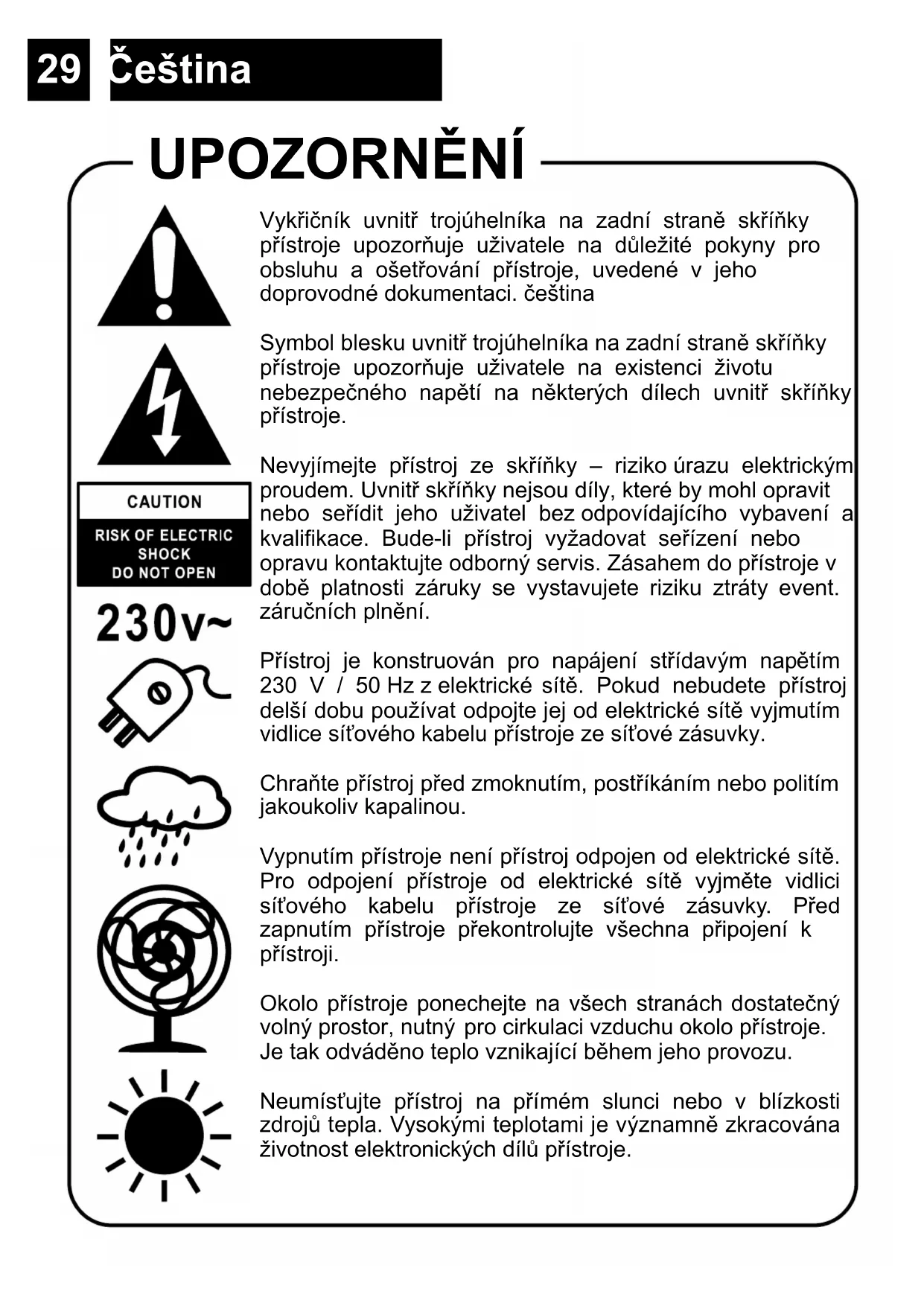 (elektrisch en elektronisch afval)29 Čeština UPOZORNĚNÍ Vykřičník uvnitř trojúhelníka na zadní straně skříňky přístroje upozorňuje uživatele na důležité pokyny pro obsluhu a ošetřování přístroje, uvedené v jeho doprovodné dokumentaci. čeština Symbol blesku uvnitř trojúhelníka na zadní straně skříňky přístroje upozorňuje uživatele na existenci životu nebezpečného napětí na některých dílech uvnitř skříňky přístroje. Nevyjímejte přístroj ze skříňky – riziko úrazu elektrickým proudem. Uvnitř skříňky nejsou díly, které by mohl opravit nebo seřídit jeho uživatel bez odpovídajícího vybavení a kvalifikace. Bude-li přístroj vyžadovat seřízení nebo opravu kontaktujte odborný servis. Zásahem do přístroje v době platnosti záruky se vystavujete riziku ztráty event. záručních plnění. Přístroj je konstruován pro napájení střídavým napětím 230 V / 50 Hz z elektrické sítě. Pokud nebudete přístroj delší dobu používat odpojte jej od elektrické sítě vyjmutím vidlice síťového kabelu přístroje ze síťové zásuvky. Chraňte přístroj před zmoknutím, postříkáním nebo politím jakoukoliv kapalinou. Vypnutím přístroje není přístroj odpojen od elektrické sítě. Pro odpojení přístroje od elektrické sítě vyjměte vidlici síťového kabelu přístroje ze síťové zásuvky. Před zapnutím přístroje překontrolujte všechna připojení k přístroji. Okolo přístroje ponechejte na všech stranách dostatečný volný prostor, nutný pro cirkulaci vzduchu okolo přístroje. Je tak odváděno teplo vznikající během jeho provozu. Neumísťujte přístroj na přímém slunci nebo v blízkosti zdrojů tepla. Vysokými teplotami je významně zkracována životnost elektronických dílů přístroje.30 Čeština