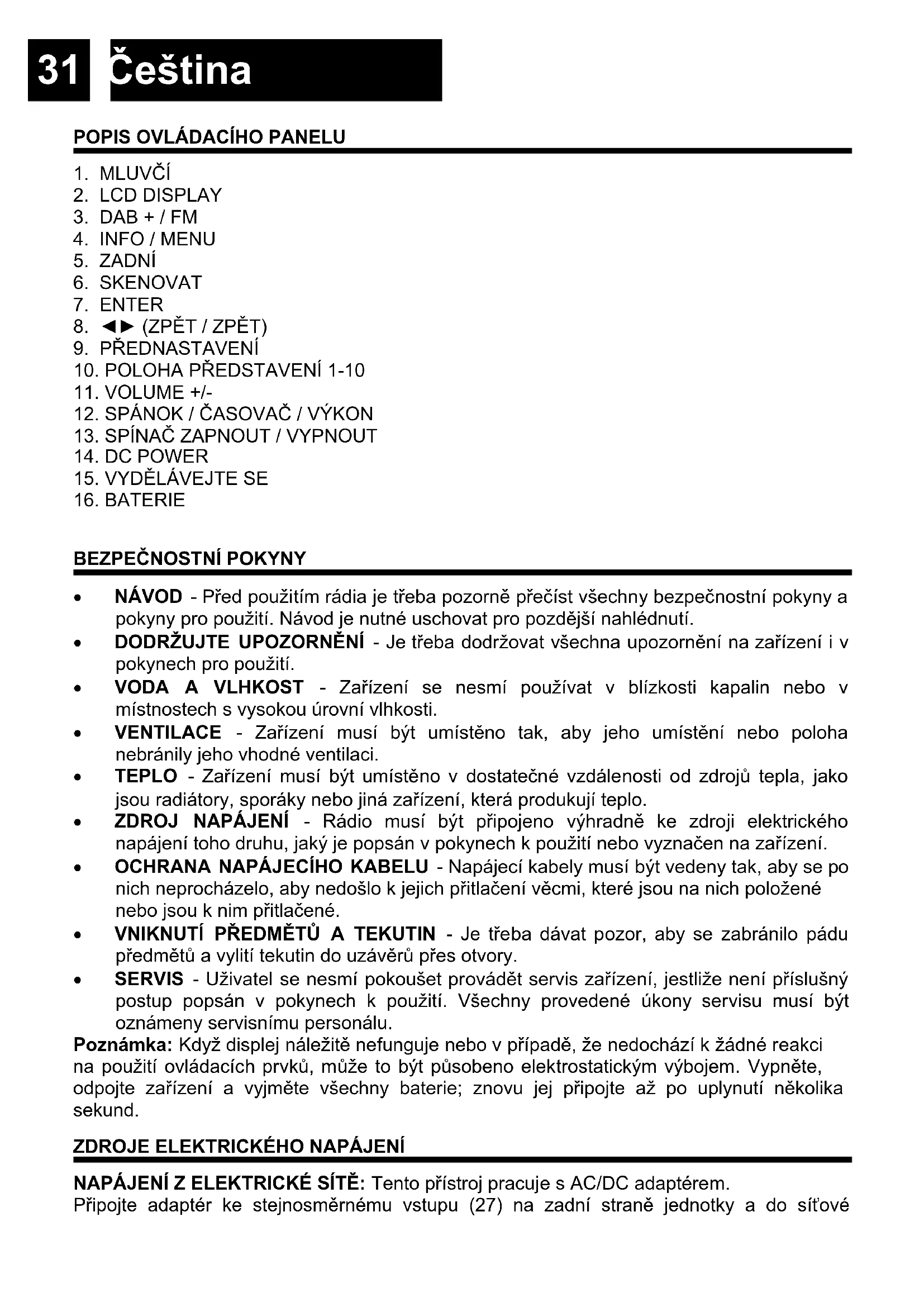 - NÁVOD - Před použitím rádia je třeba pozorně přečíst všechny bezpečnostní pokyny a pokyny pro použití. Návod je nutné uschovat pro pozdější nahlédnutí.
