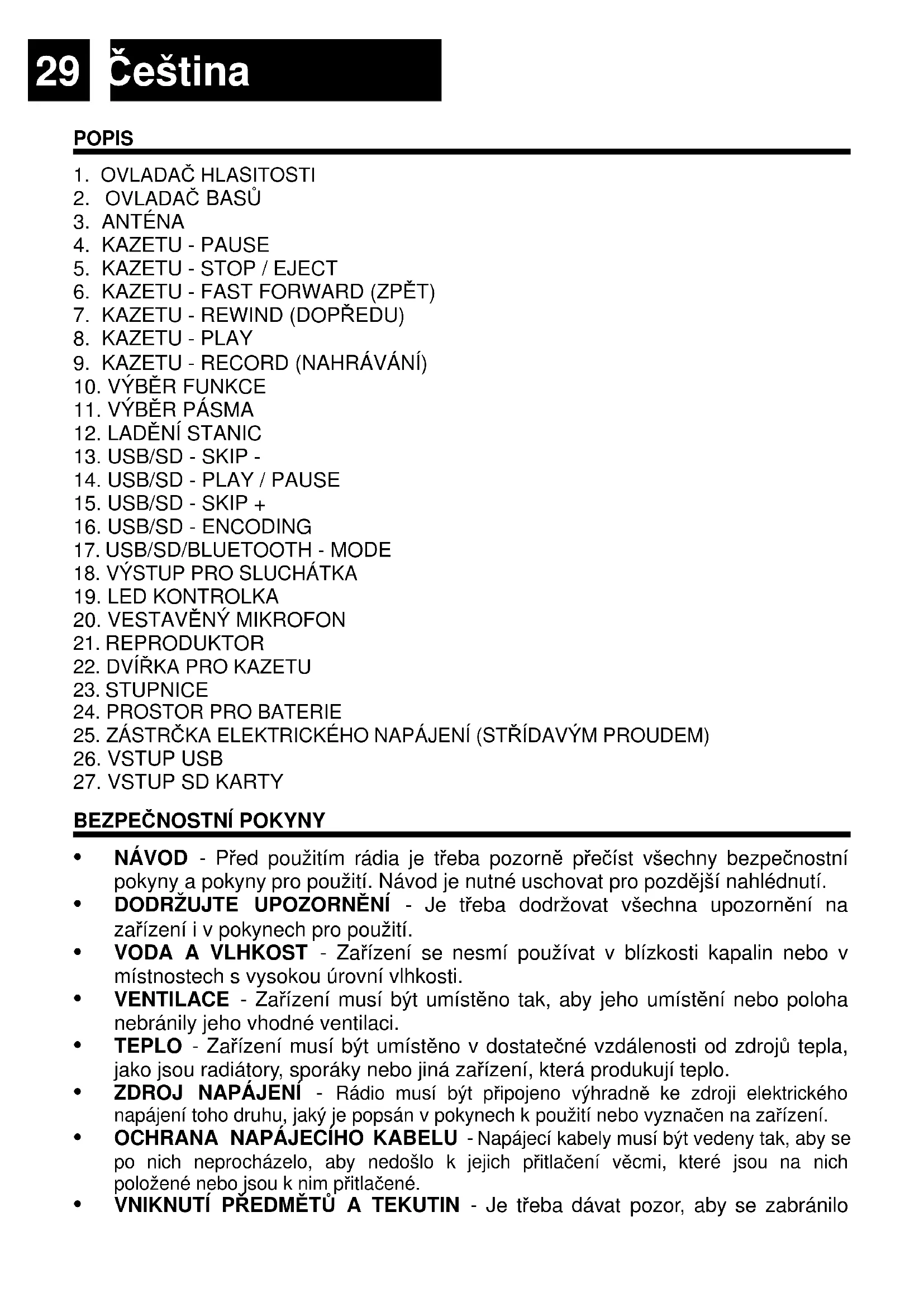 NÁVOD - Před použitím rádia je třeba pozorně přečíst všechny bezpečnostní pokyny a pokyny pro použití. Návod je nutné uschovat pro pozdější nahlédnutí.