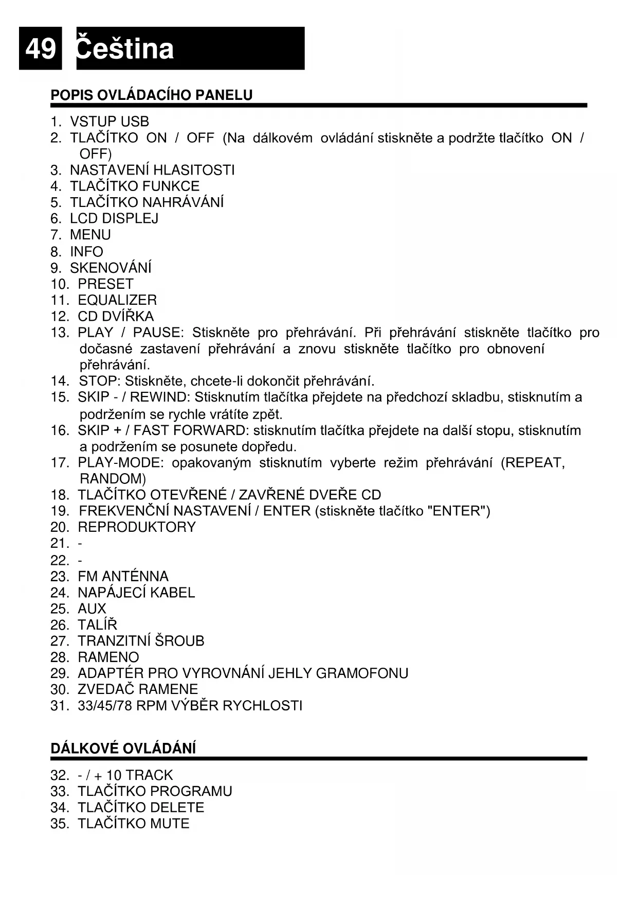 17. PLAY-MODE: opakovaným stisknutím vyberte režim přehrávání (REPEAT,