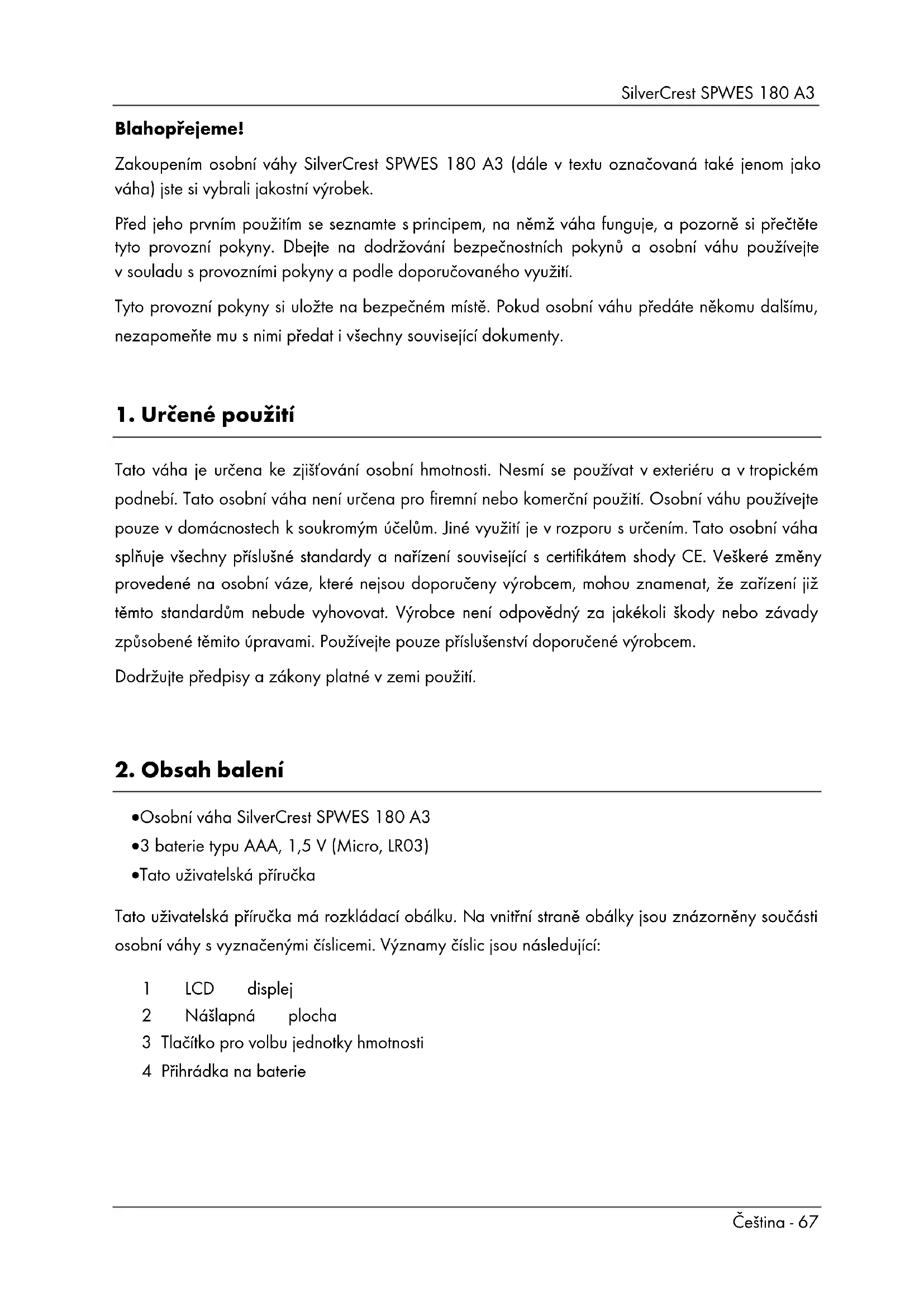 12. Informace o záruce a servisu ...................................................................... 76SilverCrest SPWES 180 A3 Čeština - 67 Blahopřejeme! Zakoupením osobní váhy SilverCrest SPWES 180 A3 (dále v textu označovaná také jenom jako váha) jste si vybrali jakostní výrobek. Před jeho prvním použitím se seznamte s principem, na němž váha funguje, a pozorně si přečtěte tyto provozní pokyny. Dbejte na dodržování bezpečnostních pokynů a osobní váhu používejte v souladu s provozními pokyny a podle doporučovaného využití. Tyto provozní pokyny si uložte na bezpečném místě. Pokud osobní váhu předáte někomu dalšímu, nezapomeňte mu s nimi předat i všechny související dokumenty.