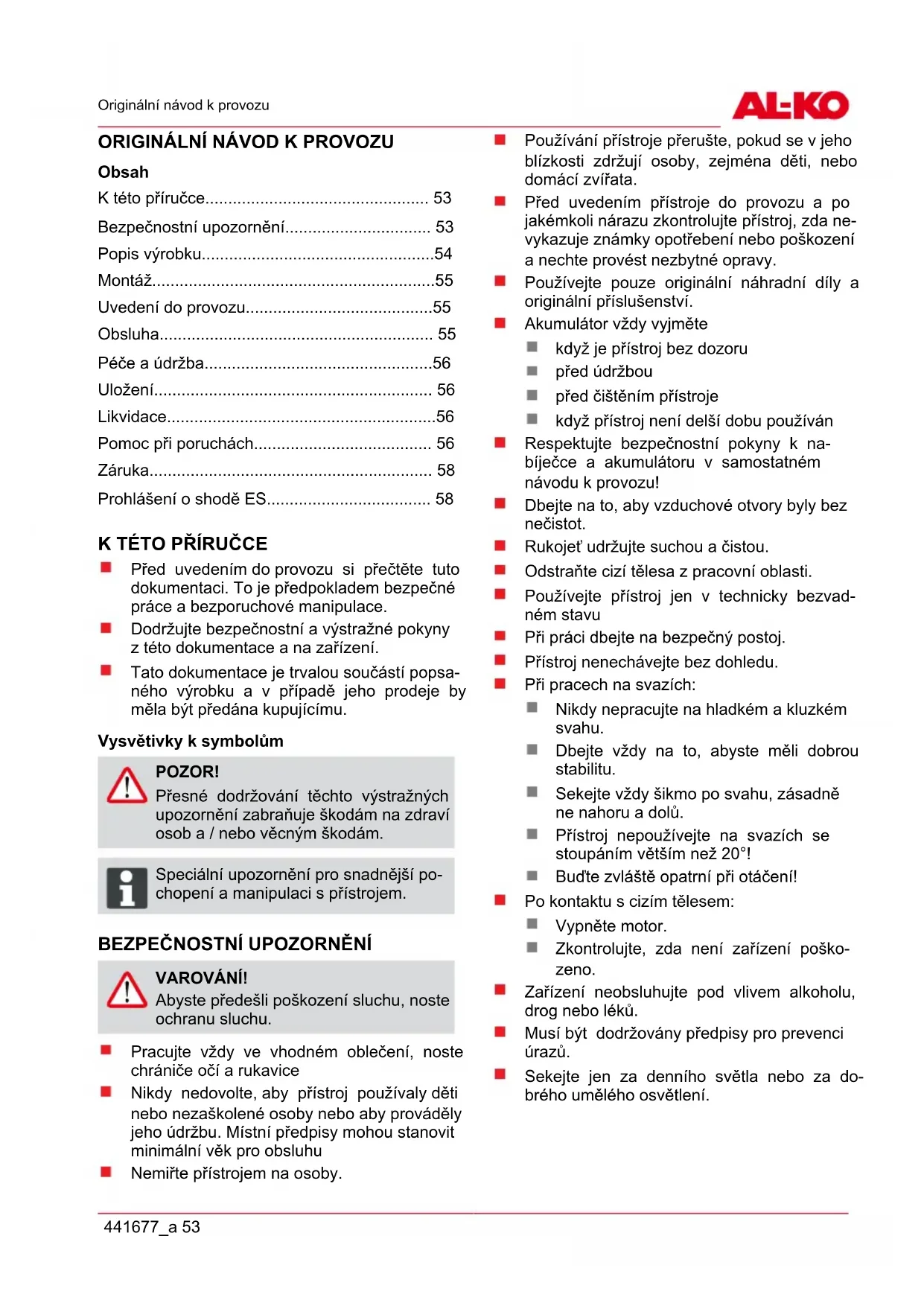 VAROVÁNÍ! Abyste předešli poškození sluchu, noste ochranu sluchu. Pracujte vždy ve vhodném oblečení, noste chrániče očí a rukavice Nikdy nedovolte, aby přístroj používaly děti nebo nezaškolené osoby nebo aby prováděly jeho údržbu. Místní předpisy mohou stanovit minimální věk pro obsluhu Nemiřte přístrojem na osoby. Používání přístroje přerušte, pokud se v jeho blízkosti zdržují osoby, zejména děti, nebo domácí zvířata. Před uvedením přístroje do provozu a po jakémkoli nárazu zkontrolujte přístroj, zda ne- vykazuje známky opotřebení nebo poškození a nechte provést nezbytné opravy. Používejte pouze originální náhradní díly a originální příslušenství. Akumulátor vždy vyjměte když je přístroj bez dozoru před údržbou před čištěním přístroje když přístroj není delší dobu používán Respektujte bezpečnostní pokyny k na- bíječce a akumulátoru v samostatném návodu k provozu! Dbejte na to, aby vzduchové otvory byly bez nečistot. Rukojeť udržujte suchou a čistou. Odstraňte cizí tělesa z pracovní oblasti. Používejte přístroj jen v technicky bezvad- ném stavu Při práci dbejte na bezpečný postoj. Přístroj nenechávejte bez dohledu. Při pracech na svazích: Nikdy nepracujte na hladkém a kluzkém svahu. Dbejte vždy na to, abyste měli dobrou stabilitu. Sekejte vždy šikmo po svahu, zásadně ne nahoru a dolů. Přístroj nepoužívejte na svazích se stoupáním větším než 20°! Buďte zvláště opatrní při otáčení! Po kontaktu s cizím tělesem: Vypněte motor. Zkontrolujte, zda není zařízení poško- zeno. Zařízení neobsluhujte pod vlivem alkoholu, drog nebo léků. Musí být dodržovány předpisy pro prevenci úrazů. Sekejte jen za denního světla nebo za do- brého umělého osvětlení.cs Bezpečnostní upozornění 54 LB 36 Li S elektrickým nářadím nepracujte ve výbušném prostředí, kde se nacházejí hořlavé kapaliny, plyny nebo prach. Elek- trické nářadí vytváří jiskry, které mohou za- pálit prach nebo výpary. Přístroj nevystavujte mokru nebo vlhkosti. Uskladněte přístroj v suchu na místě nepřís- tupném dětem a nepovolaným osobám. Bezpečnost elektrických součástí UPOZORNĚNÍ! Nebezpečí při dotyku dílů vedoucích napětí! Pokud je prodlužovací kabel poško- zený nebo prodřený, vytáhněte zástrčku okamžitě ze zásuvky! Připojení dopo- ručujeme provést přes ochranný spí- nač s jmenovitým svodovým proudem < 30 mA. Domácí síťové napětí musí souhlasit s údaji o síťovém napětí v technických údajích, ne- používat jiné napájecí napětí. Používejte pouze prodlužovací kabely, jež jsou určené pro používání venku – minimální průřez 1,5 mm