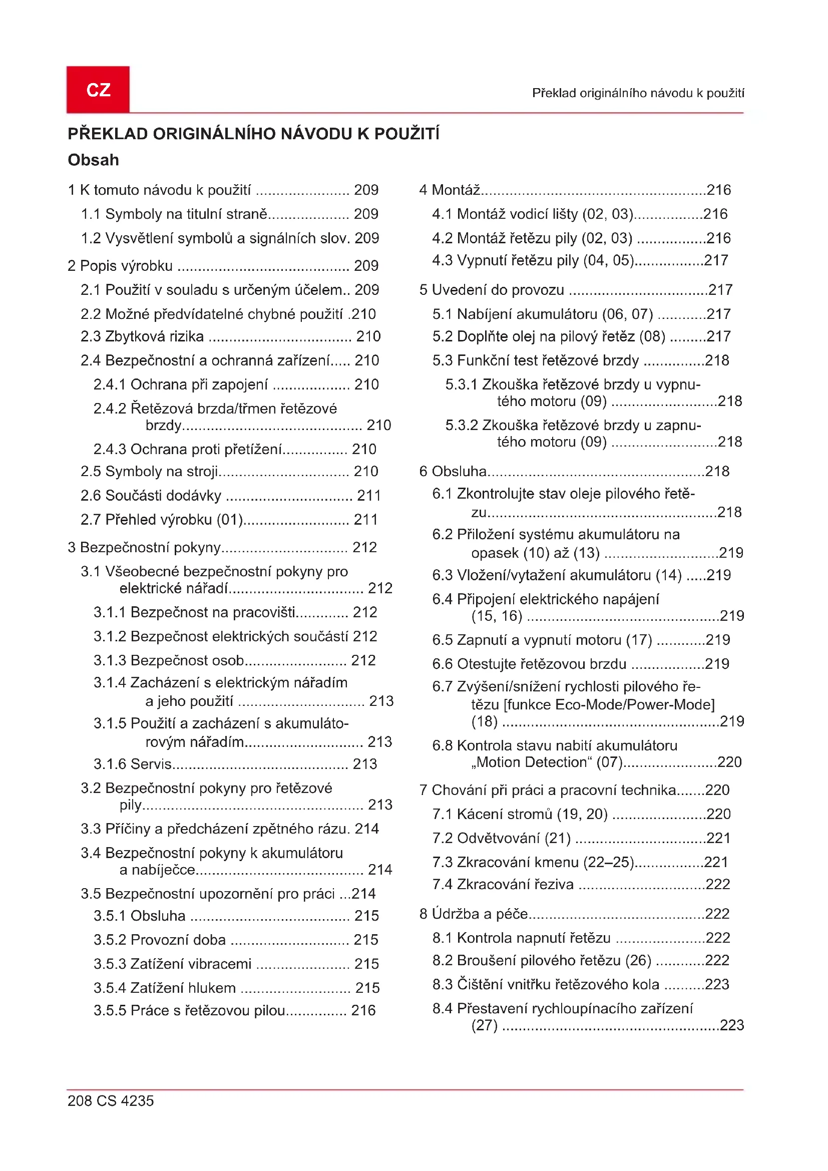Ve sběrných zařízeních výrobce (pokud je členem společného systému zpětného odbě- ru) Tato prohlášení platí pouze pro baterie a akumu- látory, které se prodávají v zemích Evropské unie469892_c 227 Technické údaje a podléhají evropské právní směrnici 2006/66/ ES. V zemích mimo Evropskou unii mohou platit odlišná ustanovení o likvidaci baterií a akumulá- torů. 13 TECHNICKÉ ÚDAJE Řetězová pila CS 4235 Č. výrobku 113616 rychlost na volnoběh 15–20m/s provozní rychlost 7–20m/s Dělení - řetězové kolo 3/8“ Řetězová brzda Ano (elektrická, PCB a brz- dová tyč) Doba doběhu řetězu (ČSN EN 60745-2-13–19.107) max. 0,15s Doba doběhu řetězu (ČSN EN 50144-2-13:2001–18.104) max. 2s Aktivace řetězu dvojnásobně Objem olejové nádrže řetězu 250ml Hmotnost s vodicí lištou a pilovým řetězem 3,80kg Hmotnost bez vodicí lišty a pilového řetězu 3,15kg Ochrana proti přetížení Ne Hladina akustického výkonu LwA (ČSN EN ISO 3744) 108dB(A) Hladina akustického tlaku LpA 88dB(A) K = 3,0dB(A) Hodnota vibrací (ČSN EN 28662-1)* 2,5m/s