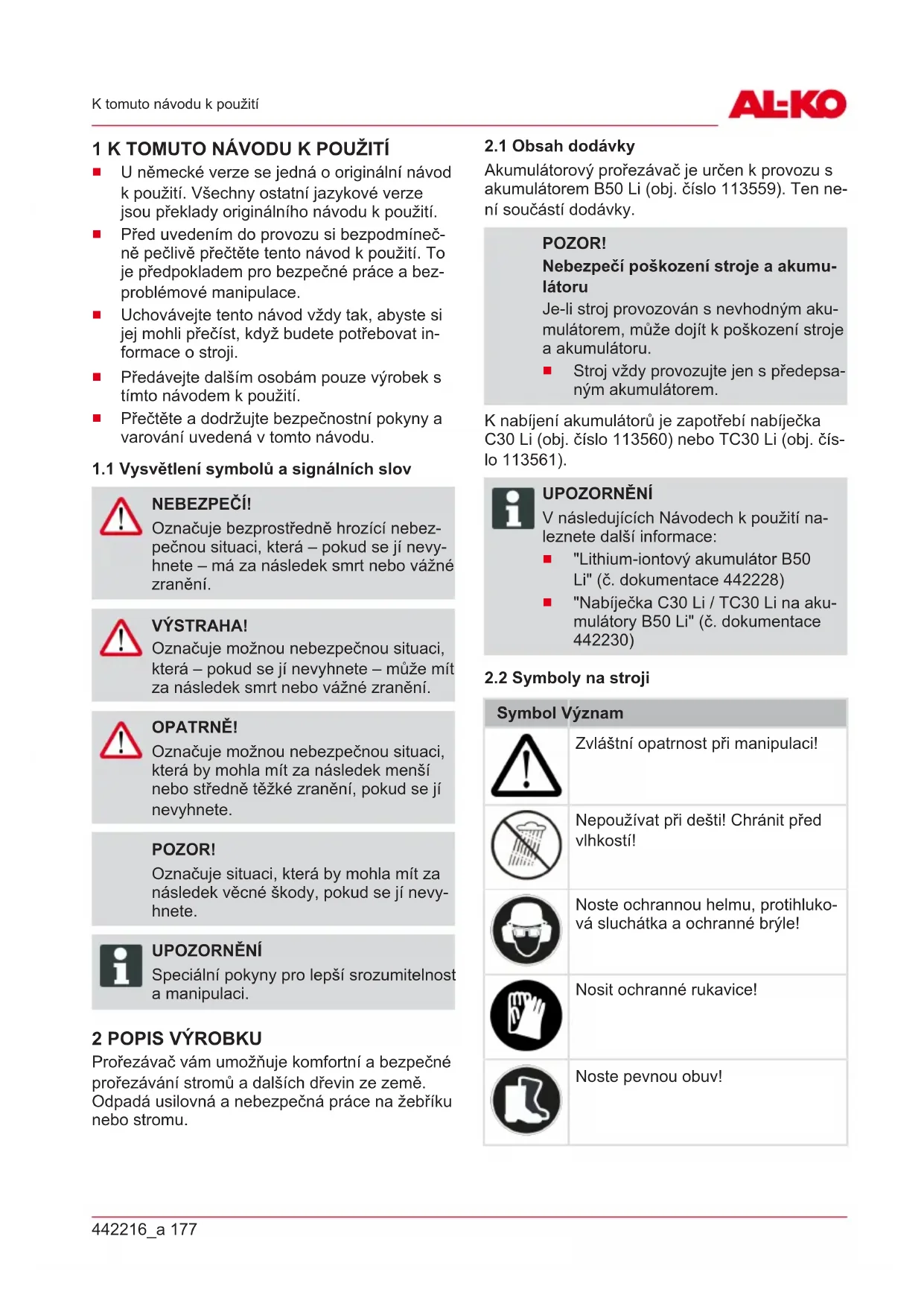 Stroj vždy provozujte jen s předepsa- ným akumulátorem. K nabíjení akumulátorů je zapotřebí nabíječka C30 Li (obj. číslo 113560) nebo TC30 Li (obj. čís- lo 113561). UPOZORNĚNÍ V následujících Návodech k použití na- leznete další informace: