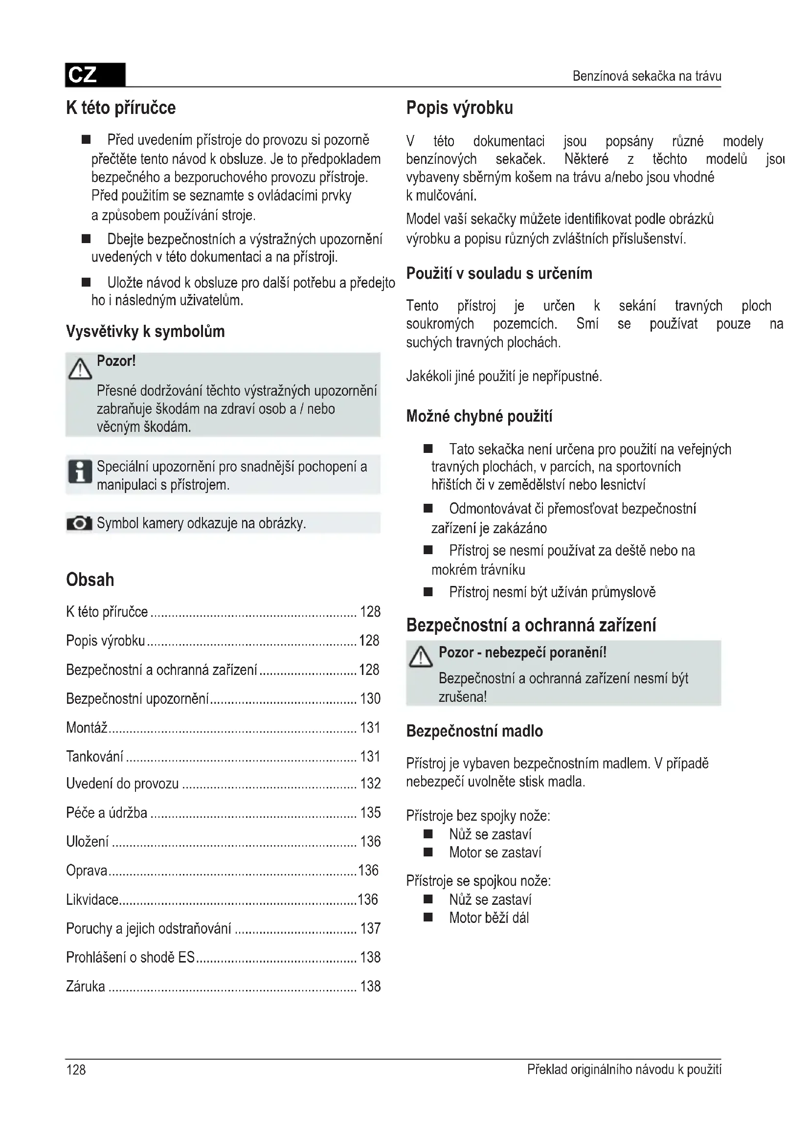 - Benzínová sekačka na trávu Obsah Ktétopříručce p. 128