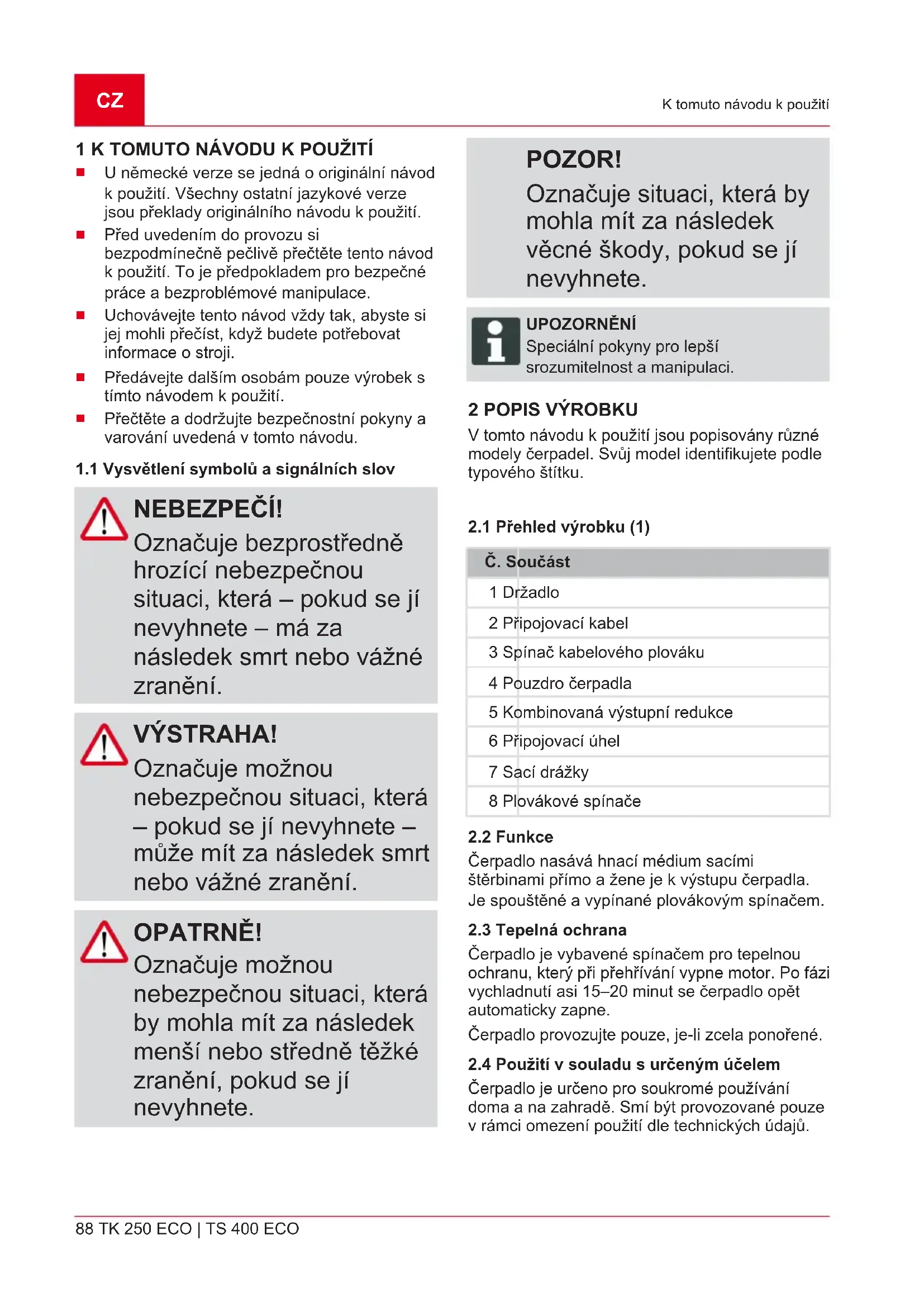 jen u čerpadla TS 400 ECO Jiné nebo rozsáhlejší používání platí za v rozporu s určeným účelem.